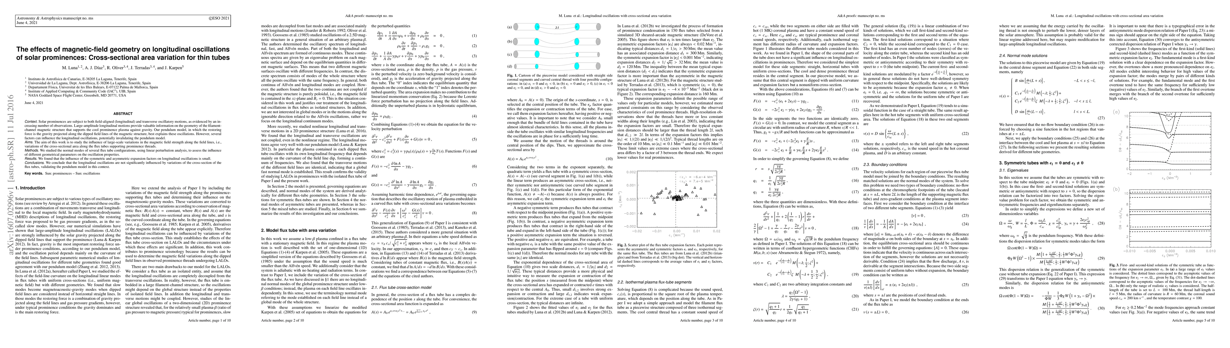This study investigates how variations in the cross-sectional area of magnetic flux tubes affect the longitudinal oscillations of solar prominences. Using a pendulum model and linear perturbation analysis, it finds that changes in the tube geometry have minimal impact on these oscillations, thereby supporting the pendulum model.