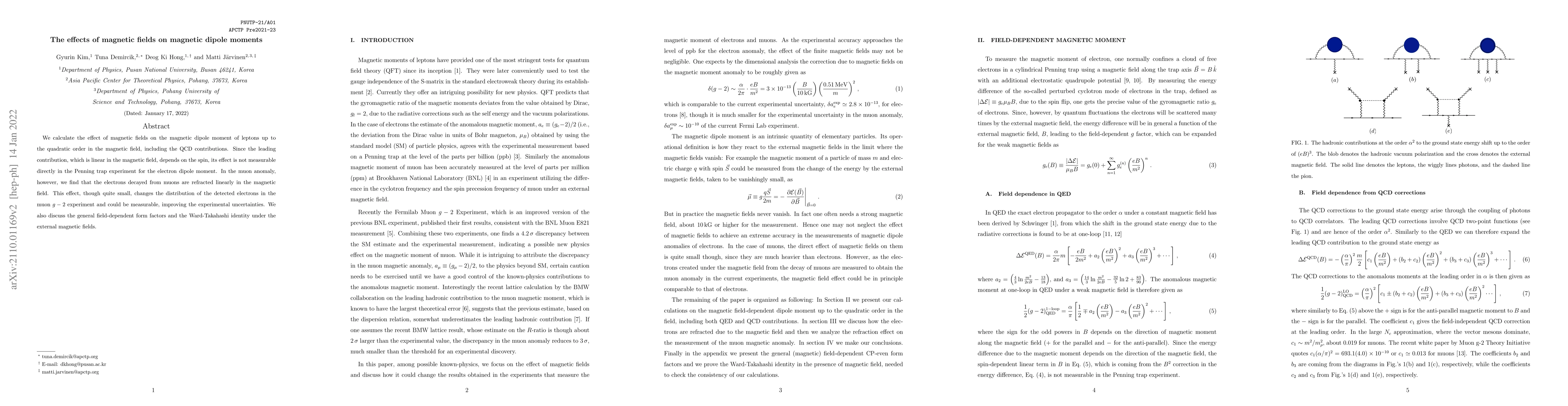 We calculate the effect of magnetic fields on the magnetic dipole moment of leptons up to the quadratic order in the magnetic field, including the QCD contributions. Since the leading contribution, which is linear in the magnetic field, depends on the spin, its effect is not measurable directly in the Penning trap experiment for the electron dipole moment. In the muon anomaly, however, we find that the electrons decayed from muons are refracted linearly in the magnetic field. This effect, though quite small, changes the distribution of the detected electrons in the muon $g-2$ experiment and could be measurable, improving the experimental uncertainties. We also discuss the general field-dependent form factors and the Ward-Takahashi identity under the external magnetic fields.