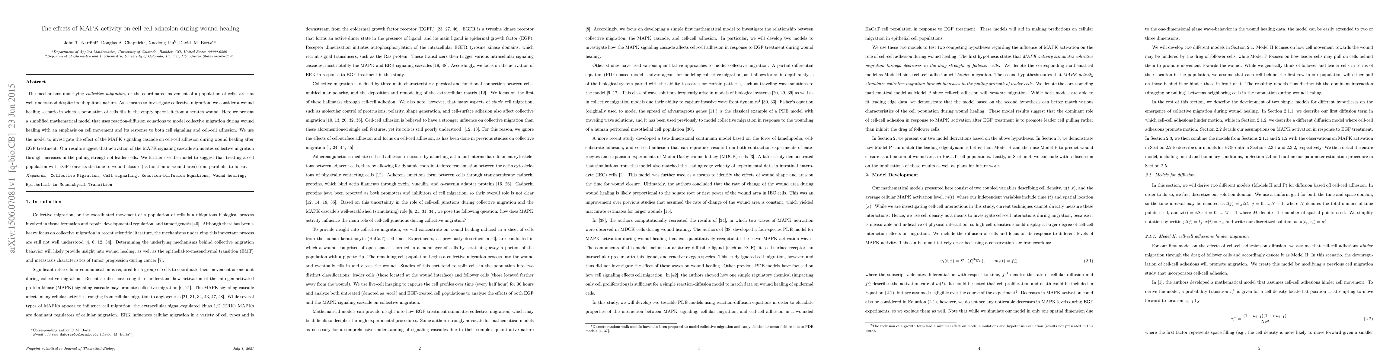 The mechanisms underlying collective migration, or the coordinated movement of a population of cells, are not well understood despite its ubiquitous nature. As a means to investigate collective migration, we consider a wound healing scenario in which a population of cells fills in the empty space left from a scratch wound. Here we present a simplified mathematical model that uses reaction-diffusion equations to model collective migration during wound healing with an emphasis on cell movement and its response to both cell signaling and cell-cell adhesion. We use the model to investigate the effect of the MAPK signaling cascade on cell-cell adhesion during wound healing after EGF treatment. Our results suggest that activation of the MAPK signaling cascade stimulates collective migration through increases in the pulling strength of leader cells. We further use the model to suggest that treating a cell population with EGF converts the time to wound closure (as function of wound area) from parabolic to linear.