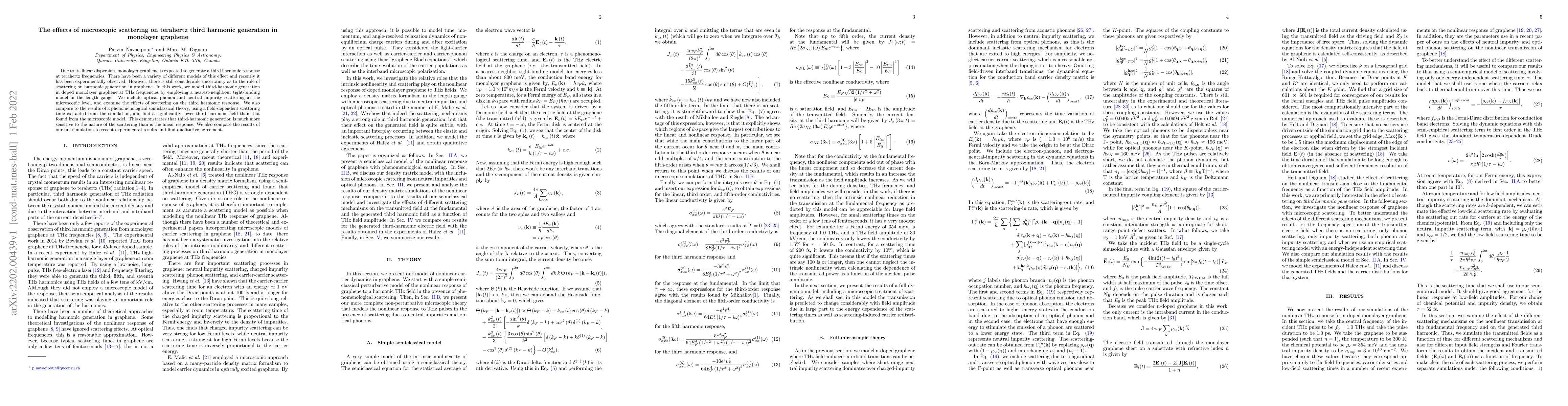 This research investigates the impact of microscopic scattering on third harmonic generation in terahertz frequencies in doped monolayer graphene, revealing that scattering significantly affects the harmonic response compared to linear response, and finds qualitative agreement with recent experimental observations.