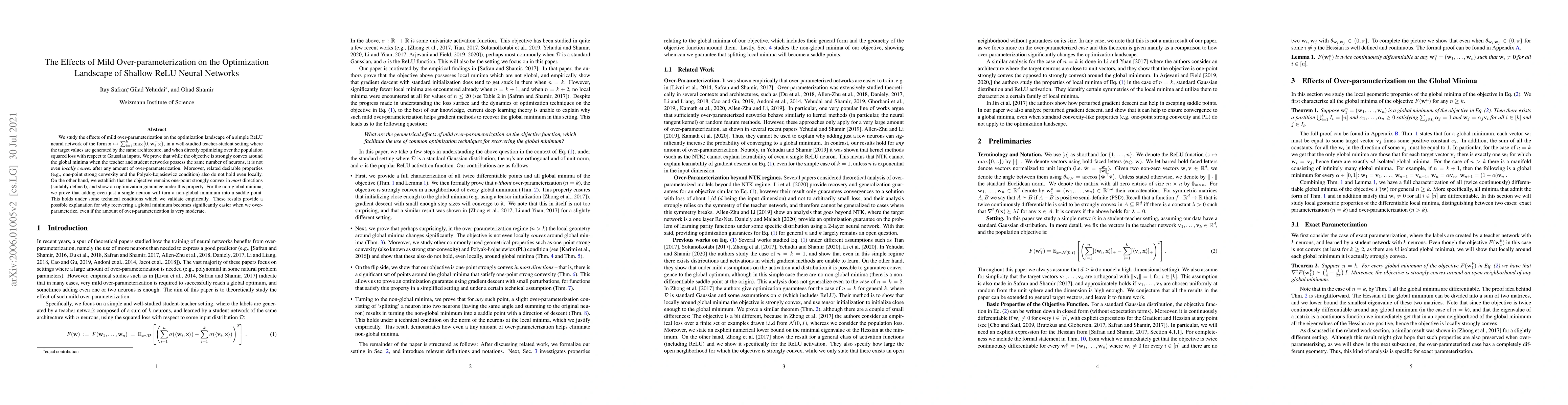 This paper investigates how mild over-parameterization affects the optimization landscape of shallow ReLU networks. It shows that while over-parameterization does not maintain local convexity, it preserves one-point strong convexity in most directions, aiding optimization. Adding just one extra neuron transforms non-global minima into saddle points, explaining easier recovery of global minima with moderate over-parameterization.