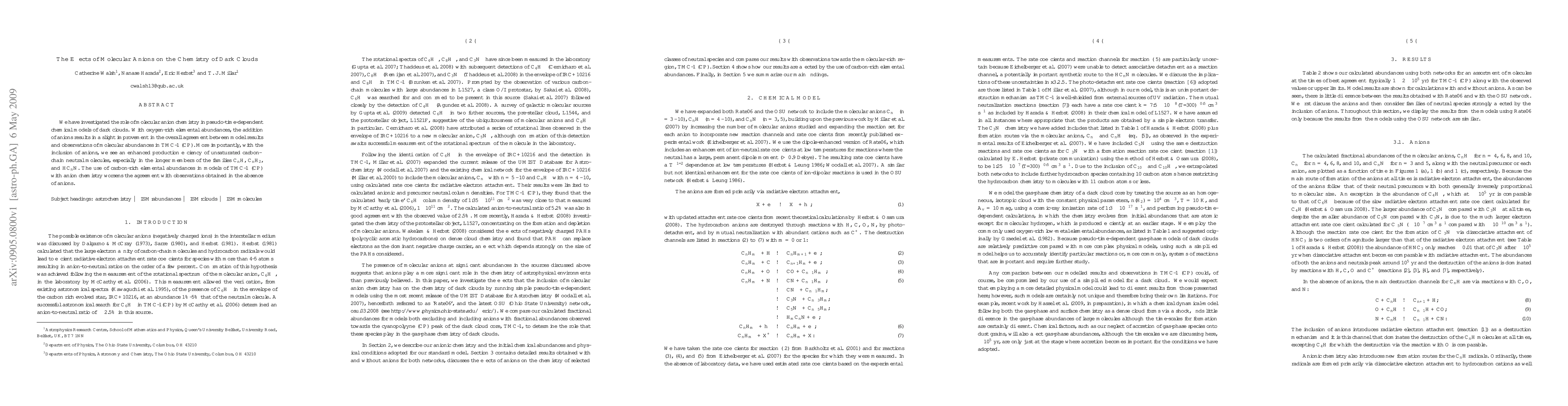 The study investigates the role of molecular anion chemistry in pseudo-time-dependent chemical models of dark clouds using both oxygen-rich and carbon-rich elemental abundances.