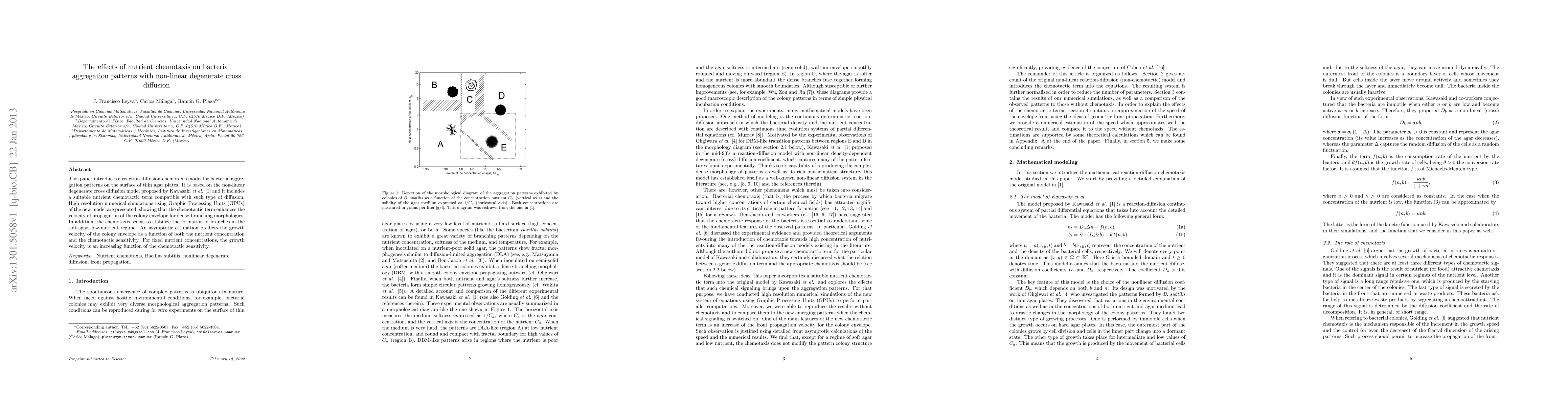 This paper introduces a reaction-diffusion-chemotaxis model for bacterial aggregation patterns on the surface of thin agar plates. It is based on the non-linear degenerate cross diffusion model proposed by Kawasaki et al. (J. of Theor. Biol. 188(2) 1997) and it includes a suitable nutrient chemotactic term compatible with such type of diffusion. High resolution numerical simulations using Graphic Processing Units (GPUs) of the new model are presented, showing that the chemotactic term enhances the velocity of propagation of the colony envelope for dense-branching morphologies. In addition, the chemotaxis seems to stabilize the formation of branches in the soft-agar, low-nutrient regime. An asymptotic estimation predicts the growth velocity of the colony envelope as a function of both the nutrient concentration and the chemotactic sensitivity. For fixed nutrient concentrations, the growth velocity is an increasing function of the chemotactic sensitivity.