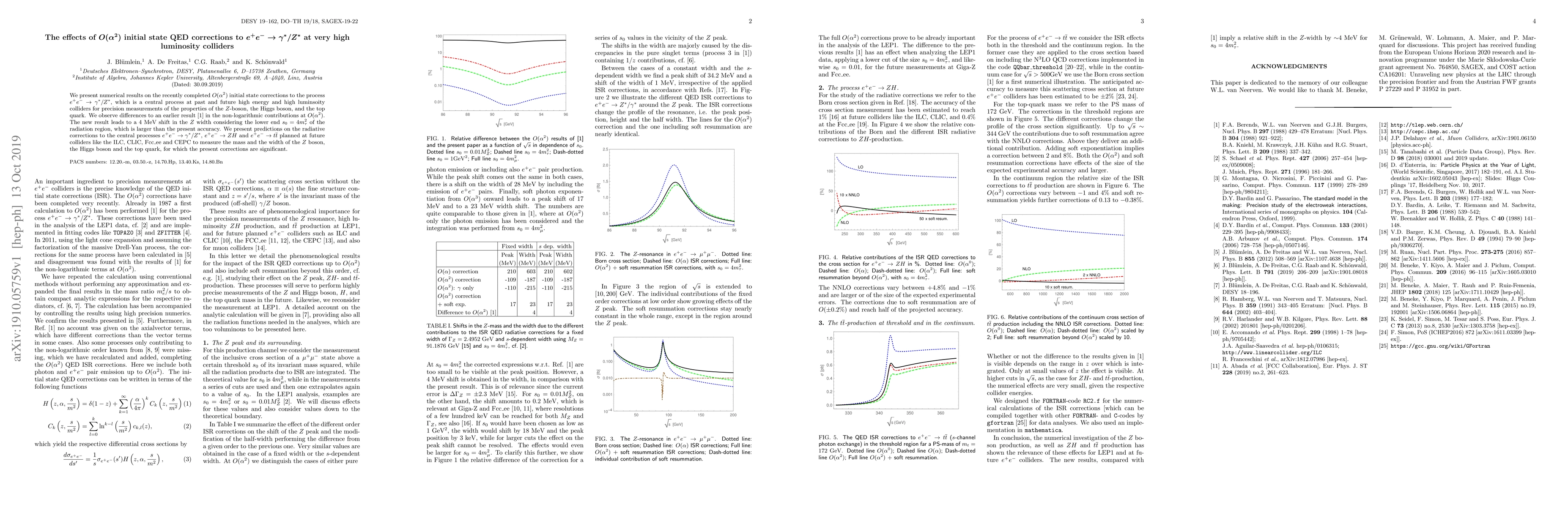 We present numerical results on the recently completed $O(\alpha^2)$ initial state corrections to the process $e^+e^- \rightarrow \gamma^*/Z^*$, which is a central process at past and future high energy and high luminsoity colliders for precision measurements of the properties of the $Z$-boson, the Higgs boson, and the top quark. We observe differences to an earlier result \cite{Berends:1987ab} in the non-logarithmic contributions at $O(\alpha^2)$. The new result leads to a 4 MeV shift in the $Z$ width considering the lower end $s_0 = 4 m_\tau^2$ of the radiation region, which is larger than the present accuracy. We present predictions on the radiative corrections to the central processes $e^+e^- \rightarrow \gamma^*/Z^*$, $e^+e^- \rightarrow Z H$ and $e^+e^- \rightarrow t \overline{t}$ planned at future colliders like the ILC, CLIC, Fcc\_ee and CEPC to measure the mass and the width of the $Z$ boson, the Higgs boson and the top quark, for which the present corrections are significant.