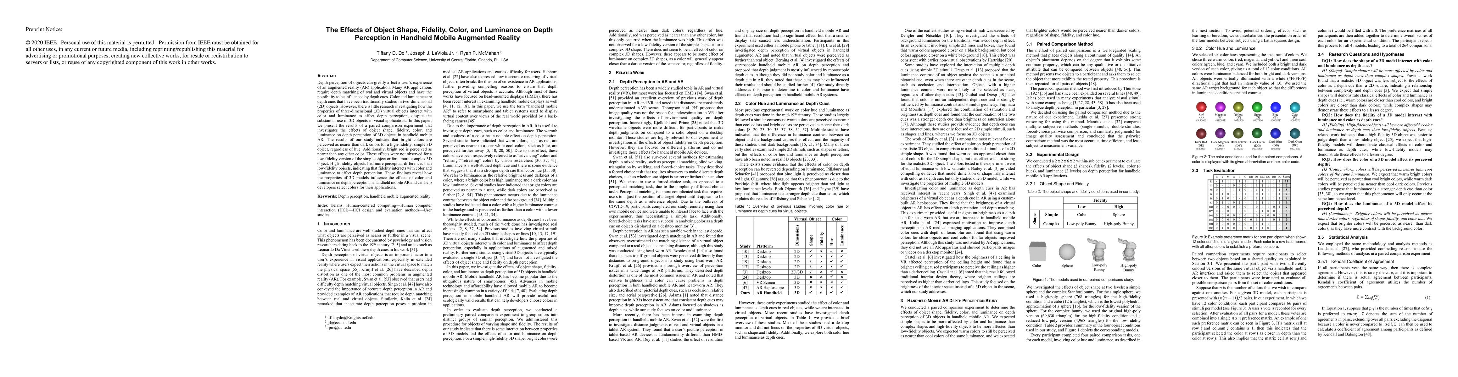 This study investigates how object shape, fidelity, color, and luminance influence depth perception in handheld mobile augmented reality. Results show that bright colors are perceived as nearer than dark colors, with bright red being the closest, but these effects vary with object fidelity and complexity. High-fidelity objects showed greater perceptual differences, indicating fidelity interacts with color and luminance to affect depth perception.
