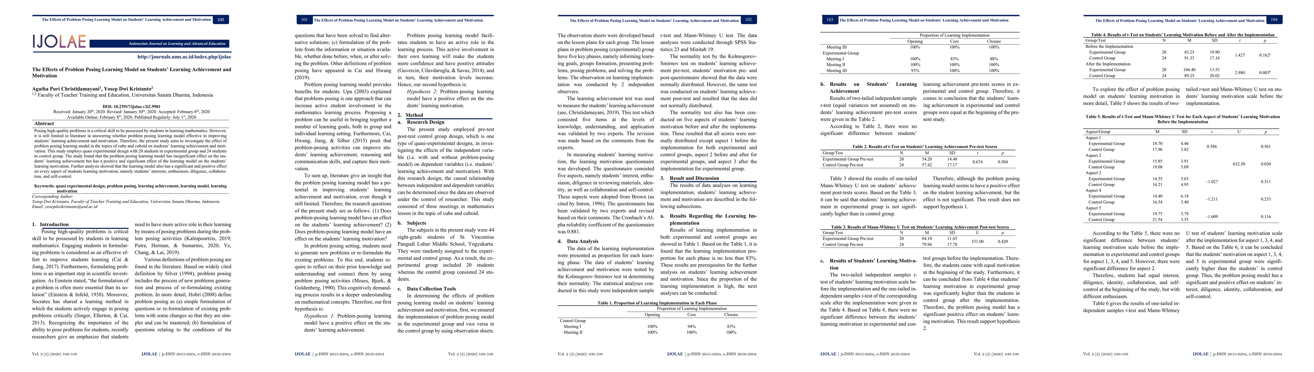 The study investigates the impact of a problem posing learning model on students' achievement and motivation in mathematics, specifically in cube and cuboid topics. The quasi-experimental design found no significant effect on learning achievement but a significant positive effect on students' motivation, including interest, enthusiasm, diligence, collaboration, and self-control.
