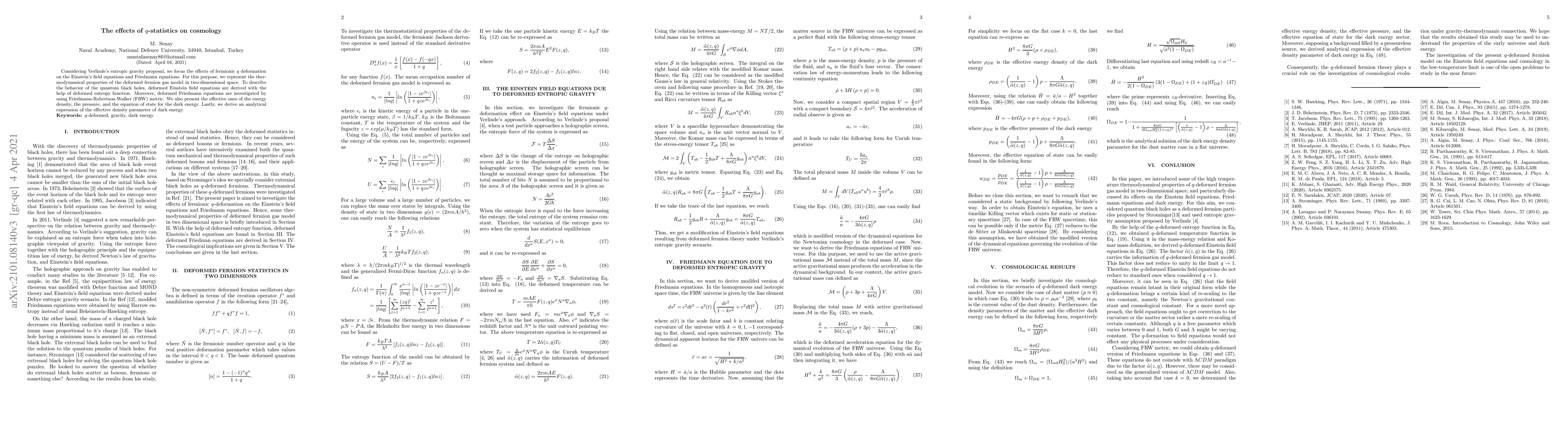 Considering Verlinde's entropic gravity proposal, we focus the effects of fermionic $q$ deformation on the Einstein's field equations and Friedmann equations. For this purpose, we represent the thermodynamical properties of the deformed fermion gas model in two-dimensional space. To describe the behavior of the quantum black holes, deformed Einstein field equations are derived with the help of deformed entropy function. Moreover, deformed Friedmann equations are investigated by using Friedmann-Robertson-Walker (FRW) metric. We also present the effective ones of the energy density, the pressure, and the equation of state for the dark energy. Lastly, we derive an analytical expression of the effective density parameter of dark energy.