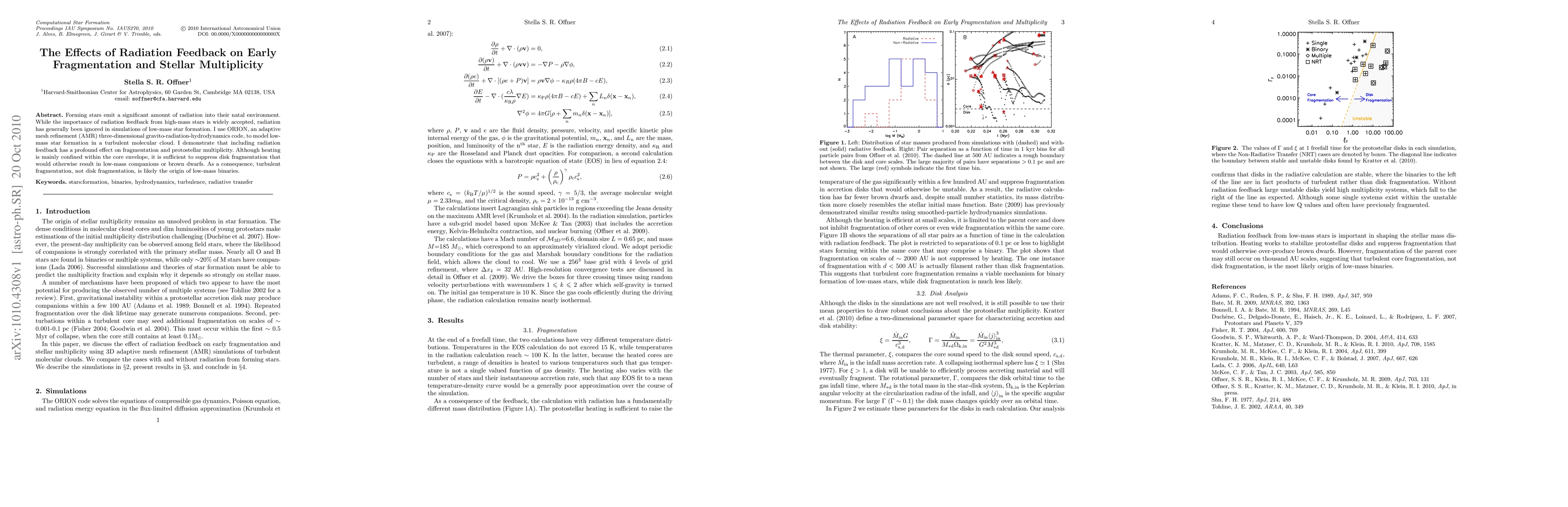 This study uses ORION to simulate low-mass star formation, revealing that radiation feedback significantly influences fragmentation and multiplicity. Radiation suppresses disk fragmentation, leading to low-mass binaries primarily from turbulent fragmentation rather than disk fragmentation.