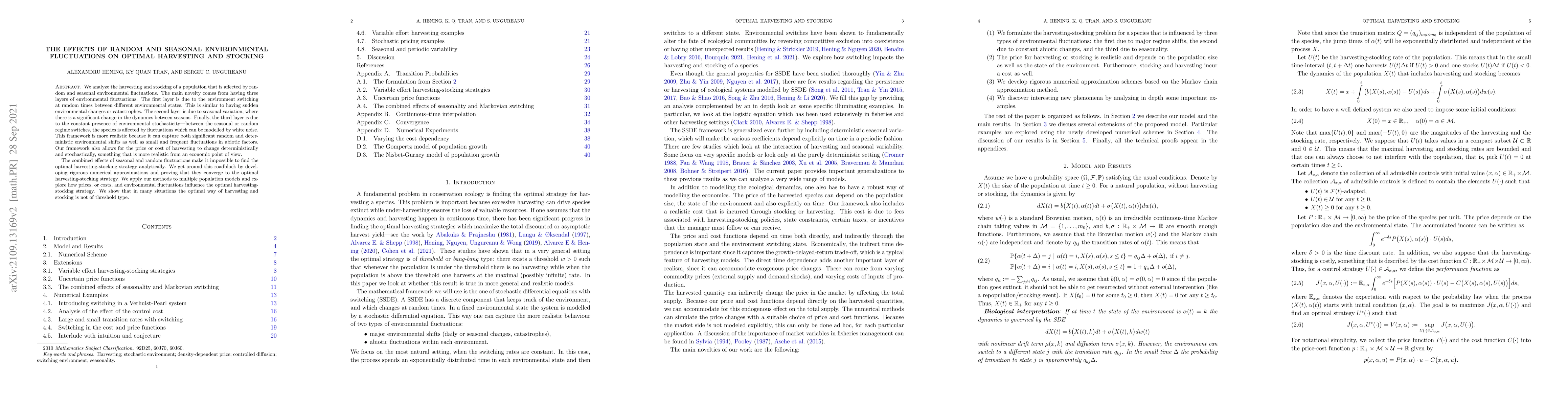 We analyze the harvesting and stocking of a population that is affected by random and seasonal environmental fluctuations. The main novelty comes from having three layers of environmental fluctuations. The first layer is due to the environment switching at random times between different environmental states. This is similar to having sudden environmental changes or catastrophes. The second layer is due to seasonal variation, where there is a significant change in the dynamics between seasons. Finally, the third layer is due to the constant presence of environmental stochasticity -- between the seasonal or random regime switches, the species is affected by fluctuations which can be modelled by white noise. This framework is more realistic because it can capture both significant random and deterministic environmental shifts as well as small and frequent fluctuations in abiotic factors. Our framework also allows for the price or cost of harvesting to change deterministically and stochastically, something that is more realistic from an economic point of view. The combined effects of seasonal and random fluctuations make it impossible to find the optimal harvesting-stocking strategy analytically. We get around this roadblock by developing rigorous numerical approximations and proving that they converge to the optimal harvesting-stocking strategy. We apply our methods to multiple population models and explore how prices, or costs, and environmental fluctuations influence the optimal harvesting-stocking strategy. We show that in many situations the optimal way of harvesting and stocking is not of threshold type.