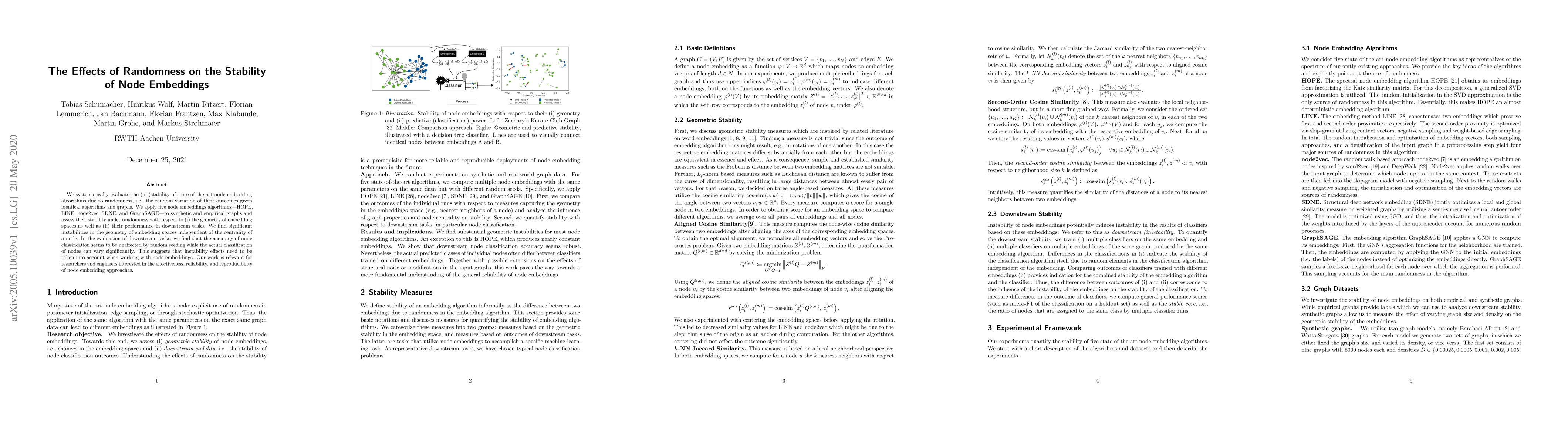 We systematically evaluate the (in-)stability of state-of-the-art node embedding algorithms due to randomness, i.e., the random variation of their outcomes given identical algorithms and graphs. We apply five node embeddings algorithms---HOPE, LINE, node2vec, SDNE, and GraphSAGE---to synthetic and empirical graphs and assess their stability under randomness with respect to (i) the geometry of embedding spaces as well as (ii) their performance in downstream tasks. We find significant instabilities in the geometry of embedding spaces independent of the centrality of a node. In the evaluation of downstream tasks, we find that the accuracy of node classification seems to be unaffected by random seeding while the actual classification of nodes can vary significantly. This suggests that instability effects need to be taken into account when working with node embeddings. Our work is relevant for researchers and engineers interested in the effectiveness, reliability, and reproducibility of node embedding approaches.