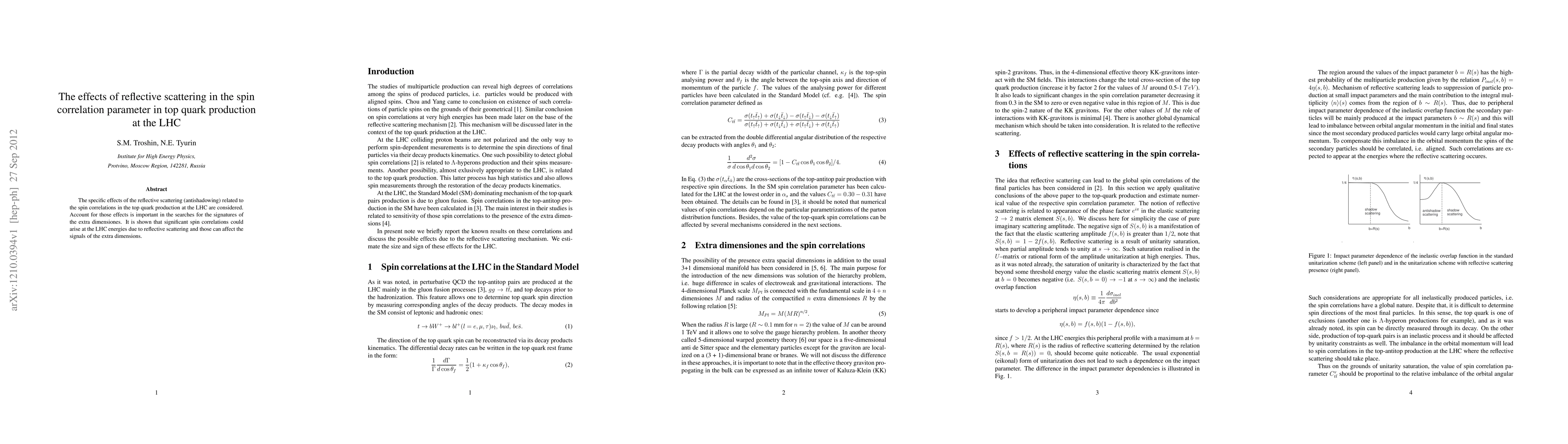 The specific effects of the reflective scattering (antishadowing) related to the spin correlations in the top quark production at the LHC are considered. Account for those effects is important in the searches for the signatures of the extra dimensiones. It is shown that significant spin correlations could arise at the LHC energies due to reflective scattering and those can affect the signals of the extra dimensions.