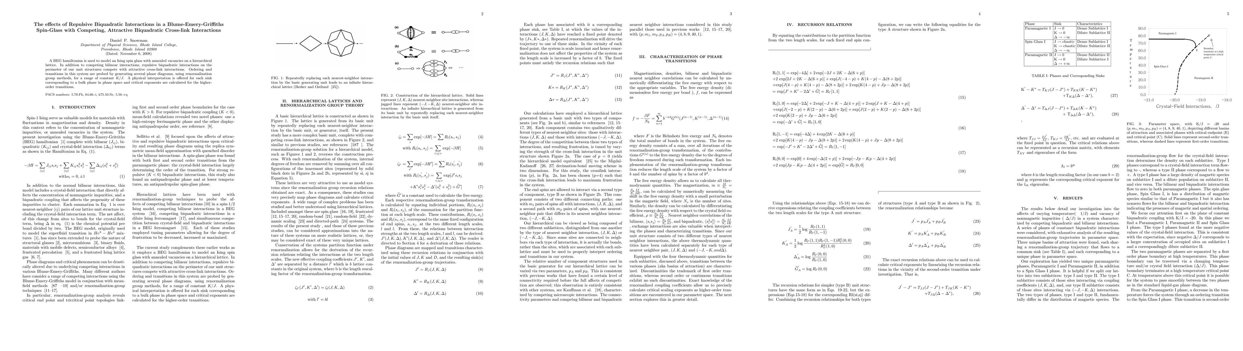 A BEG Hamiltonian is used to model an Ising spin glass with annealed vacancies on a hierarchical lattice. In addition to competing bilinear interactions, repulsive biquadratic interactions on the perimeter of our unit structures compete with attractive cross-link interactions. Ordering and transitions in this system are probed by generating several phase diagrams, using renormalization group methods, for a range of constant K/J. A physical interpretation is offered for each sink corresponding to a bulk phase in phase space and critical exponents are calculated for the higher-order transitions.