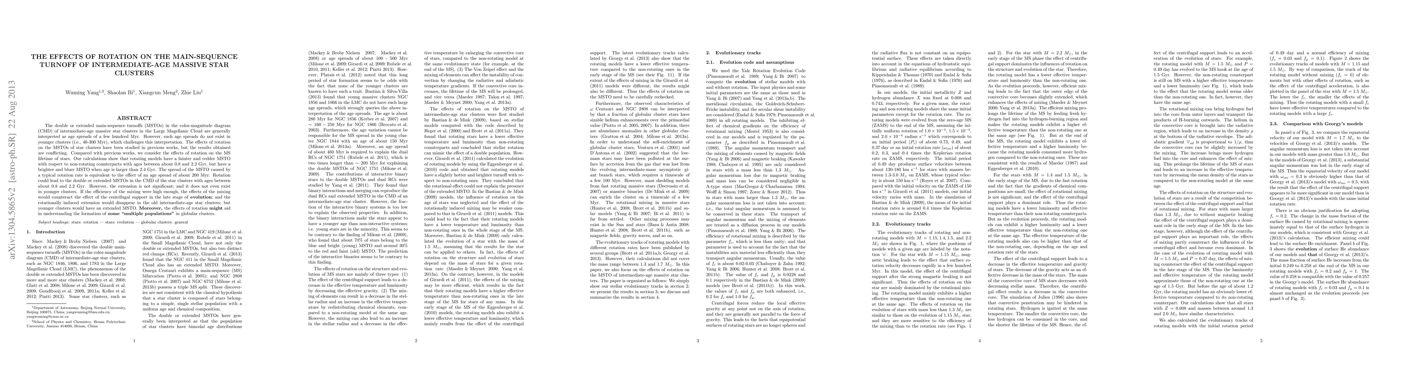 The double or extended main-sequence turnoffs (MSTOs) in the color-magnitude diagram (CMD) of intermediate-age massive star clusters in the Large Magellanic Cloud are generally interpreted as age spreads of a few hundred Myr. However, such age spreads do not exist in younger clusters (i.e., 40-300 Myr), which challenges this interpretation. The effects of rotation on the MSTOs of star clusters have been studied in previous works, but the results obtained are conflicting. Compared with previous works, we consider the effects of rotation on the MS lifetime of stars. Our calculations show that rotating models have a fainter and redder MSTO with respect to non-rotating counterparts with ages between about 0.8 and 2.2 Gyr, but have a brighter and bluer MSTO when age is larger than 2.4 Gyr. The spread of the MSTO caused by a typical rotation rate is equivalent to the effect of an age spread of about 200 Myr. Rotation could lead to the double or extended MSTOs in the CMD of the star clusters with ages between about 0.8 and 2.2 Gyr. However, the extension is not significant; and it does not even exist in younger clusters. If the efficiency of the mixing were high enough, the effects of the mixing would counteract the effect of the centrifugal support in the late stage of evolution; and the rotationally induced extension would disappear in the old intermediate-age star clusters; but younger clusters would have an extended MSTO. Moreover, the effects of rotation might aid in understanding the formation of some "multiple populations" in globular clusters.
