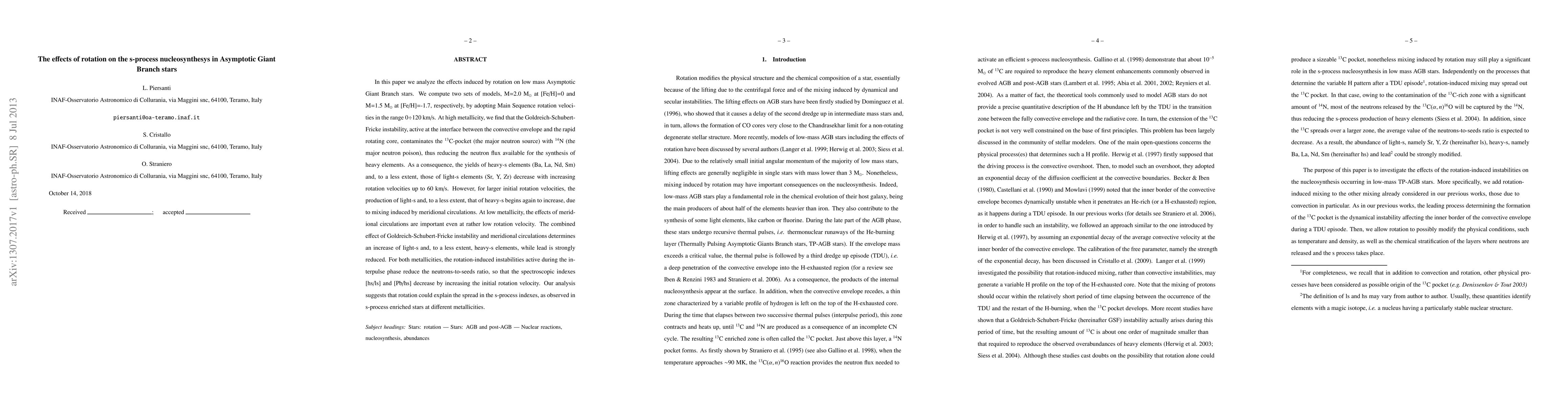 In this paper we analyze the effects induced by rotation on low mass Asymptotic Giant Branch stars. We compute two sets of models, M=2.0 Msun at [Fe/H]=0 and M=1.5 Msun at [Fe/H]=-1.7, respectively, by adopting Main Sequence rotation velocities in the range 0 - 120 km/s. At high metallicity, we find that the Goldreich-Schubert-Fricke instability, active at the interface between the convective envelope and the rapid rotating core, contaminates the 13C-pocket (the major neutron source) with 14N (the major neutron poison), thus reducing the neutron flux available for the synthesis of heavy elements. As a consequence, the yields of heavy-s elements (Ba, La, Nd, Sm) and, to a less extent, those of light-s elements (Sr, Y, Zr) decrease with increasing rotation velocities up to 60 km/s. However, for larger initial rotation velocities, the production of light-s and, to a less extent, that of heavy-s begins again to increase, due to mixing induced by meridional circulations. At low metallicity, the effects of meridional circulations are important even at rather low rotation velocity. The combined effect of Goldreich-Schubert-Fricke instability and meridional circulations determines an increase of light-s and, to a less extent, heavy-s elements, while lead is strongly reduced. For both metallicities, the rotation-induced instabilities active during the interpulse phase reduce the neutrons-to-seeds ratio, so that the spectroscopic indexes [hs/ls] and [Pb/hs] decrease by increasing the initial rotation velocity. Our analysis suggests that rotation could explain the spread in the s-process indexes, as observed in s-process enriched stars at different metallicities.
