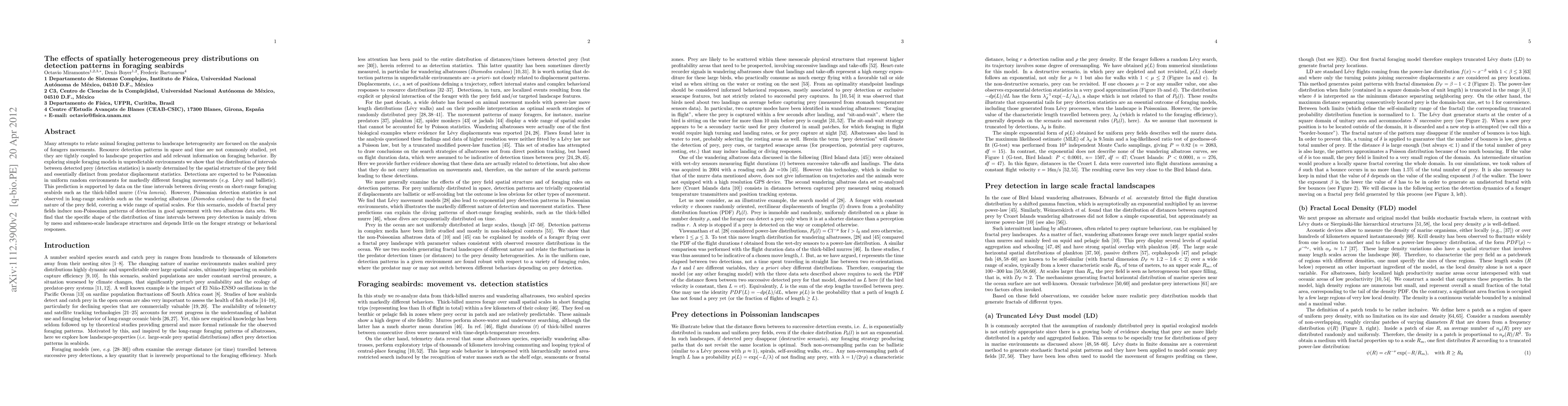 This paper investigates how the spatial distribution of prey affects the detection patterns of foraging seabirds, finding that detection statistics are primarily determined by the prey's spatial structure rather than the predator's movement patterns. It concludes that while short-range foraging seabirds show Poissonian detection intervals, long-range seabirds exhibit non-Poissonian patterns due to the fractal nature of their prey fields.
