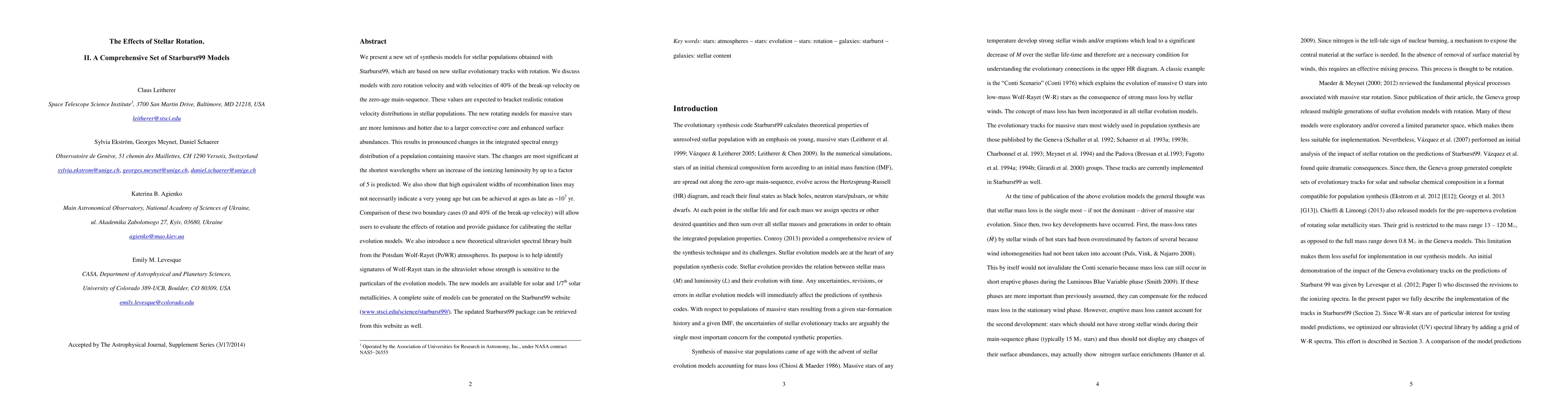 The paper presents updated Starburst99 models incorporating stellar rotation effects, using new evolutionary tracks with rotation velocities of 0% and 40% of break-up velocity on the zero-age main-sequence. These models show massive stars become more luminous and hotter due to a larger convective core and enhanced surface abundances. The changes in spectral energy distribution are most significant at short wavelengths, with ionizing luminosity increasing up to a factor of 5. The study also introduces a new theoretical UV spectral library from Potsdam Wolf-Rayet atmospheres to identify Wolf-Rayet star signatures. The models are available for solar and 1/7th solar metallicities on the Starburst99 website.