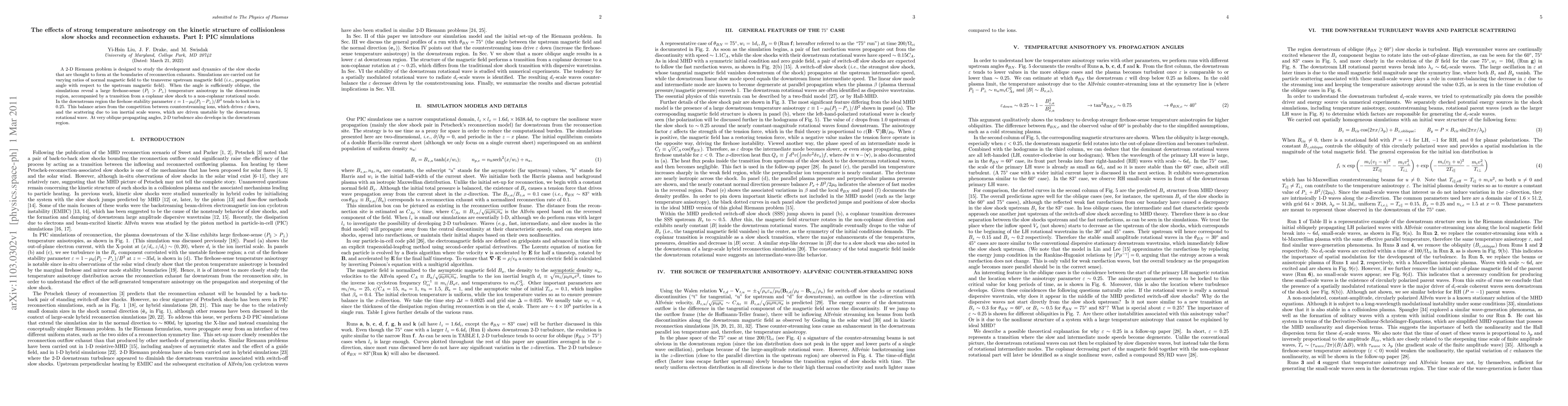 Research simulates 2D slow shock formations at reconnection exhausts with varying magnetic field angles, finding a strong temperature anisotropy in downstream regions accompanied by rotation modes.