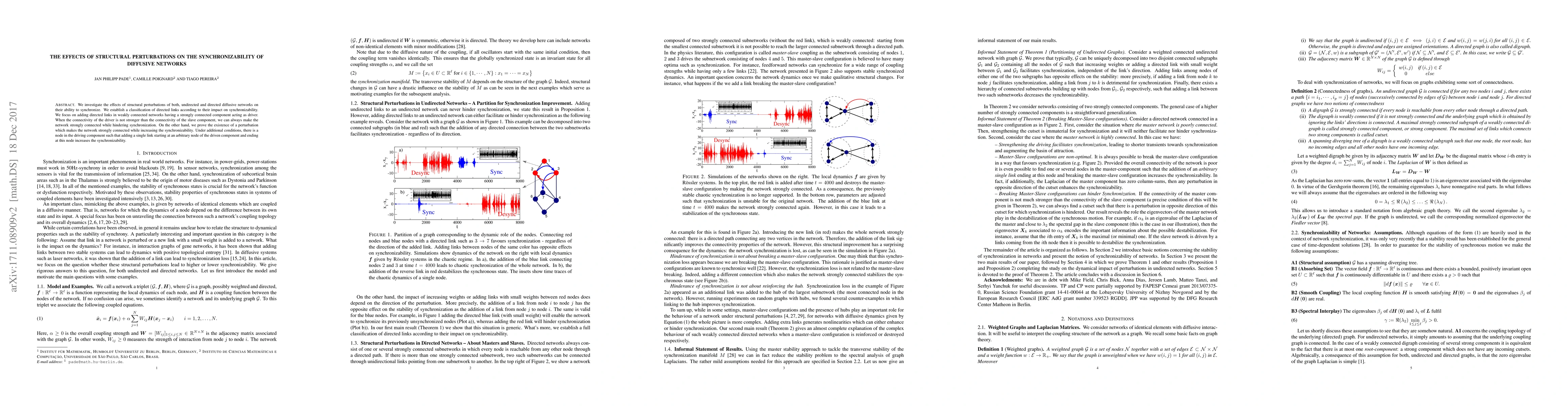 We investigate the effects of structural perturbations of both, undirected and directed diffusive networks on their ability to synchronize. We establish a classification of directed links according to their impact on synchronizability. We focus on adding directed links in weakly connected networks having a strongly connected component acting as driver. When the connectivity of the driver is not stronger than the connectivity of the slave component, we can always make the network strongly connected while hindering synchronization. On the other hand, we prove the existence of a perturbation which makes the network strongly connected while increasing the synchronizability. Under additional conditions, there is a node in the driving component such that adding a single link starting at an arbitrary node of the driven component and ending at this node increases the synchronizability.