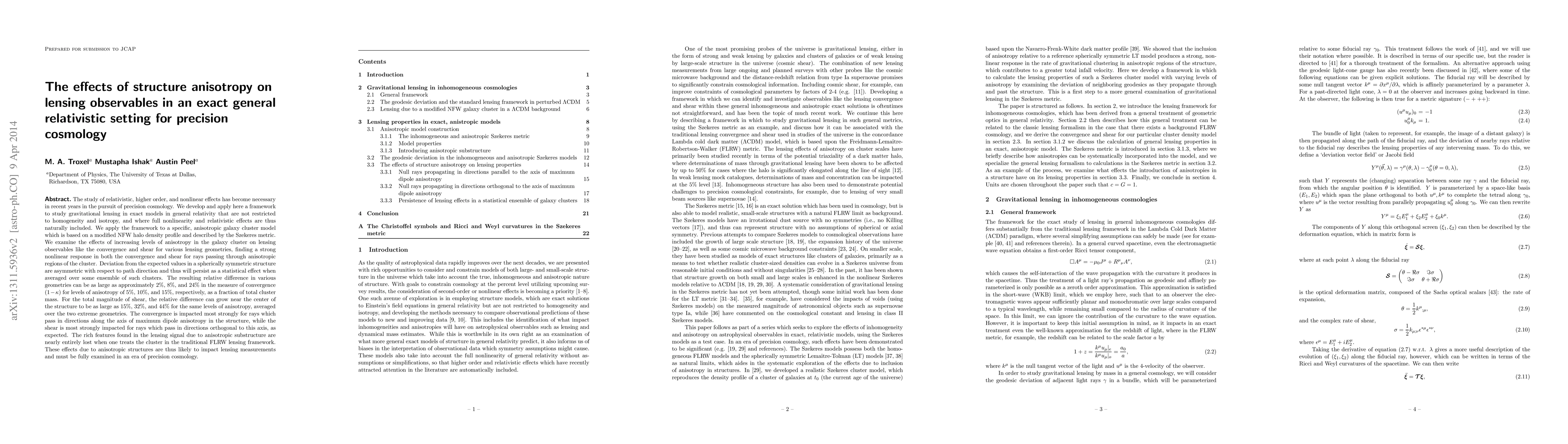 The study of relativistic, higher order and nonlinear effects has become necessary in recent years in the pursuit of precision cosmology. We develop and apply here a framework to study gravitational lensing in exact models in general relativity that are not restricted to homogeneity and isotropy, and where full nonlinearity and relativistic effects are included. We apply the framework to a specific, anisotropic galaxy cluster model which is based on a modified NFW halo density profile and described by the Szekeres metric. We examine the effects of increasing levels of anisotropy in the galaxy cluster on lensing observables like the convergence and shear for various lensing geometries, finding a strong nonlinear response in both the convergence and shear for rays passing through anisotropic regions of the cluster. Deviation from the expected values in a spherically symmetric structure are asymmetric with respect to path direction and thus will persist as a statistical effect when averaged over some ensemble of such clusters. The resulting relative difference in various geometries can be as large as approximately 2%, 8%, and 24% in the measure of convergence for levels of anisotropy of 5%, 10%, and 15%, respectively, as a fraction of total cluster mass. For the total magnitude of shear, the relative difference can grow near the center of the structure to be as large as 15%, 32%, and 44% for the same levels of anisotropy, averaged over the two extreme geometries. The convergence is impacted most strongly for rays which pass in directions along the axis of maximum dipole anisotropy in the structure, while the shear is most strongly impacted for rays which pass in directions orthogonal to this axis, as expected. These effects due to anisotropic structures will affect lensing measurements and must be fully examined in an era of precision cosmology.