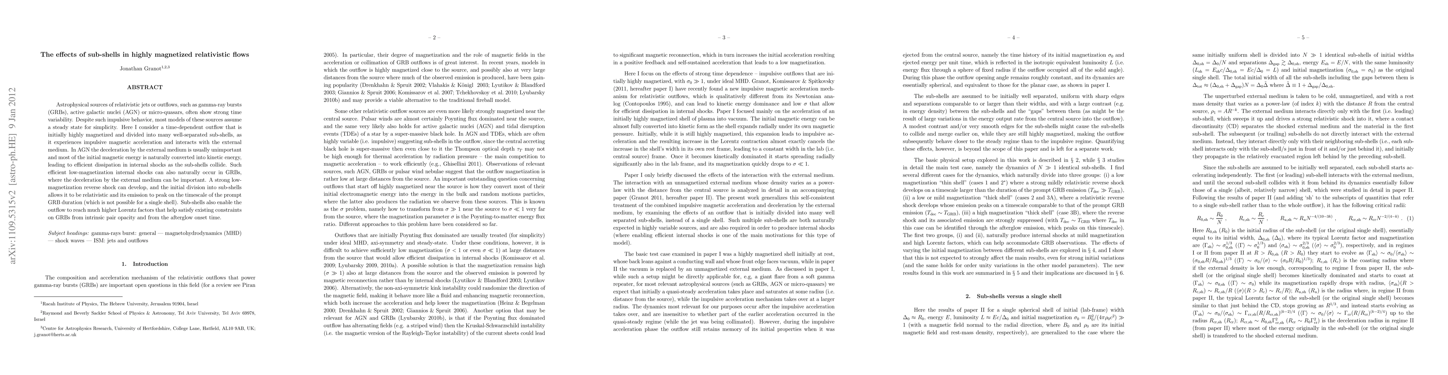 Astrophysical sources of relativistic jets or outflows, such as gamma-ray bursts (GRBs), active galactic nuclei (AGN) or micro-quasars, often show strong time variability. Despite such impulsive behavior, most models of these sources assume a steady state for simplicity. Here I consider a time-dependent outflow that is initially highly magnetized and divided into many well-separated sub-shells, as it experiences impulsive magnetic acceleration and interacts with the external medium. In AGN the deceleration by the external medium is usually unimportant and most of the initial magnetic energy is naturally converted into kinetic energy, leading to efficient dissipation in internal shocks as the sub-shells collide. Such efficient low-magnetization internal shocks can also naturally occur in GRBs, where the deceleration by the external medium can be important. A strong low-magnetization reverse shock can develop, and the initial division into sub-shells allows it to be relativistic and its emission to peak on the timescale of the prompt GRB duration (which is not possible for a single shell). Sub-shells also enable the outflow to reach much higher Lorentz factors that help satisfy existing constraints on GRBs from intrinsic pair opacity and from the afterglow onset time.