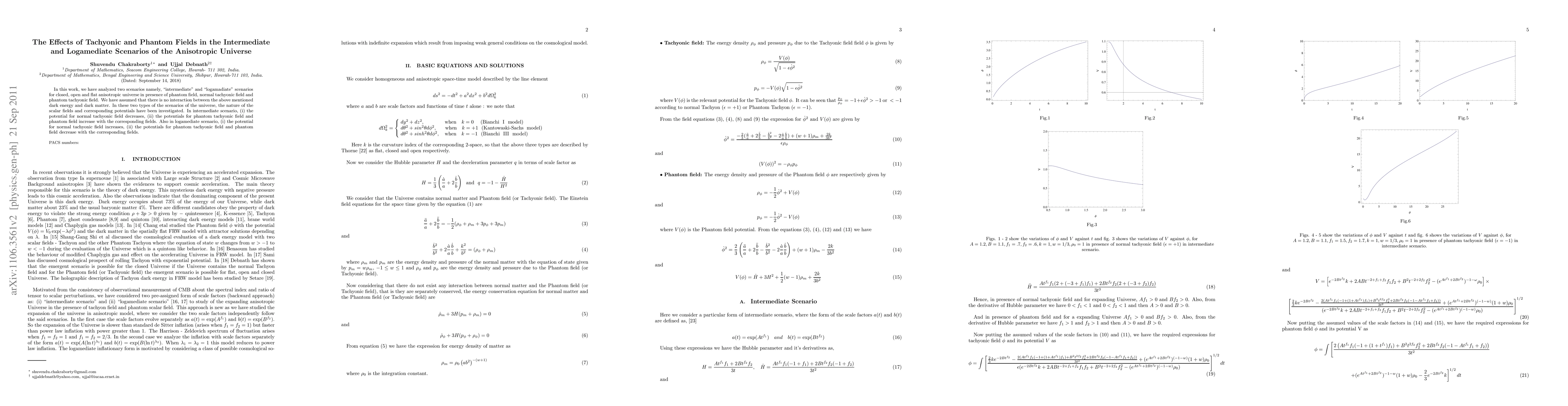 In this work, we have analyzed two scenarios namely, "intermediate" and "logamadiate" scenarios for closed, open and flat anisotropic universe in presence of phantom field, normal tachyonic field and phantom tachyonic field. We have assumed that there is no interaction between the above mentioned dark energy and dark matter. In these two types of the scenarios of the universe, the nature of the scalar fields and corresponding potentials have been investigated. In intermediate scenario, (i) the potential for normal tachyonic field decreases, (ii) the potentials for phantom tachyonic field and phantom field increase with the corresponding fields. Also in logamediate scenario, (i) the potential for normal tachyonic field increases, (ii) the potentials for phantom tachyonic field and phantom field decrease with the corresponding fields.