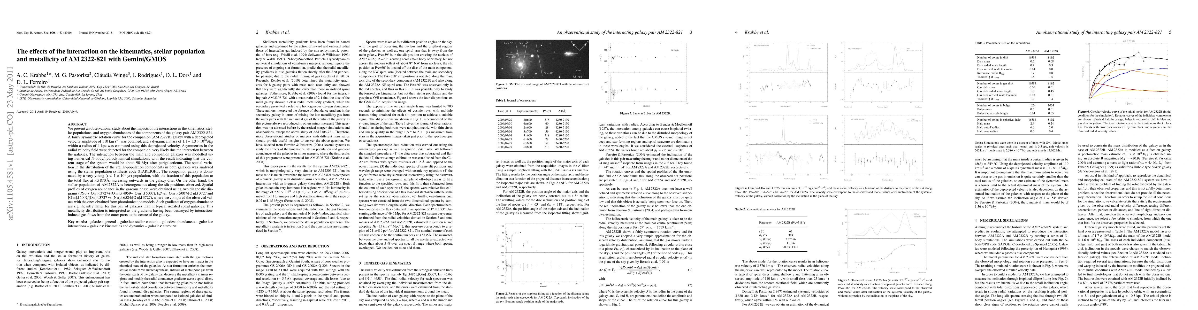 We present an observational study about the impacts of the interactions in the kinematics, stellar populations, and oxygen abundances of the components of the galaxy pair AM\,2322-821. A fairly symmetric rotation curve for the companion (AM\,2322B) galaxy with a deprojected velocity amplitude of 110 km s$^{-1}$ was obtained, and a dynamical mass of $ 1.1 - 1.3 \times 10^{10} M_{\sun}$ within a radius of 4 kpc was estimated using this deprojected velocity. Asymmetries in the radial velocity field were detected for the companion, very likely due the interaction between the galaxies. The interaction between the main and companion galaxies was modelled using numerical N-body/hydrodynamical simulations, with the result indicating that the current stage of the system would be about 90 Myr after perigalacticum. The spatial variation in the distribution of the stellar-population components in both galaxies was analysed using the stellar population synthesis code {\sc STARLIGHT}. The companion galaxy is dominated by a very young (t $ \leq 1\times10^{8}$ yr) population, with the fraction of this population to the total flux at $\lambda\, 5\,870\, \AA$, increasing outwards in the galaxy disc. On the other hand, the stellar population of AM\,2322A is heterogeneous along the slit positions observed. Spatial profiles of oxygen abundance in the gaseous phase were obtained using the diagnostic diagram R23 vs. [OIII]/[OII], where we compared the observed values with the ones obtained from photoionization models. Such gradients of oxygen abundance are significantly flatter for this pair of galaxies than in typical isolated spiral galaxies. This metallicity distribution is interpreted as the gradients having been destroyed by interaction-induced gas flows from the outer parts to the centre of the galaxy