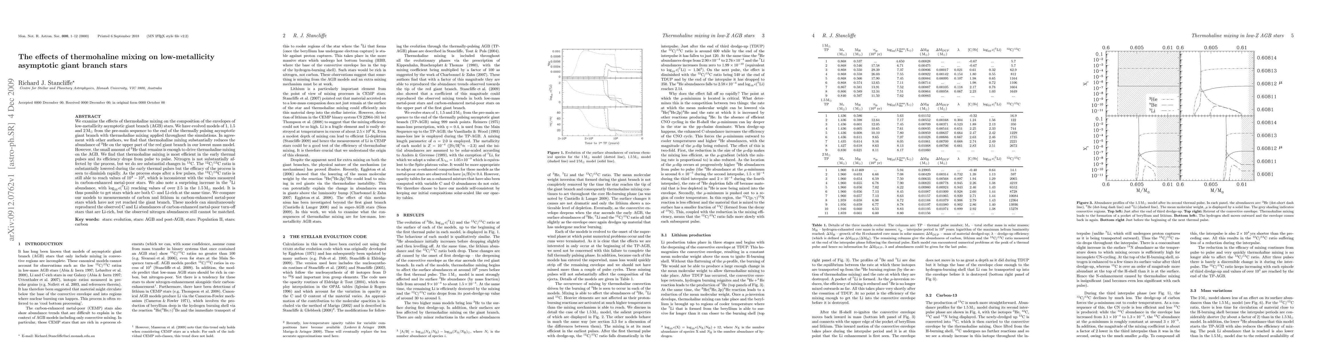 This study investigates the impact of thermohaline mixing on low-metallicity asymptotic giant branch stars, finding it significantly reduces helium-3 and alters carbon-13 abundances, while also unexpectedly increasing lithium-7. The results suggest these mixed models can reproduce the carbon and lithium abundances in carbon-enhanced metal-poor stars, though nitrogen abundances remain unmatched.