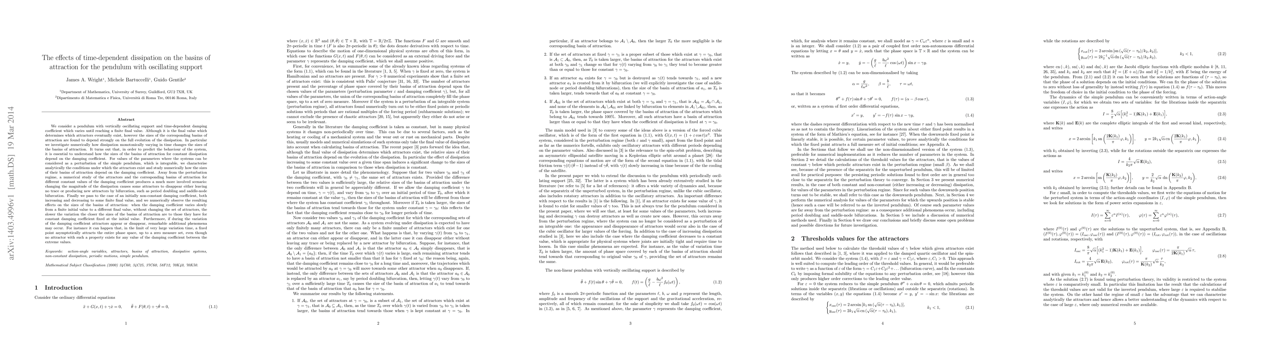 This paper investigates the impact of time-dependent dissipation on the basins of attraction for a pendulum with an oscillating support. It finds that the sizes of these basins depend significantly on the full evolution of the dissipation, with complex behaviors observed in both perturbation and non-perturbation regimes, including bifurcation phenomena and changes in attractors.