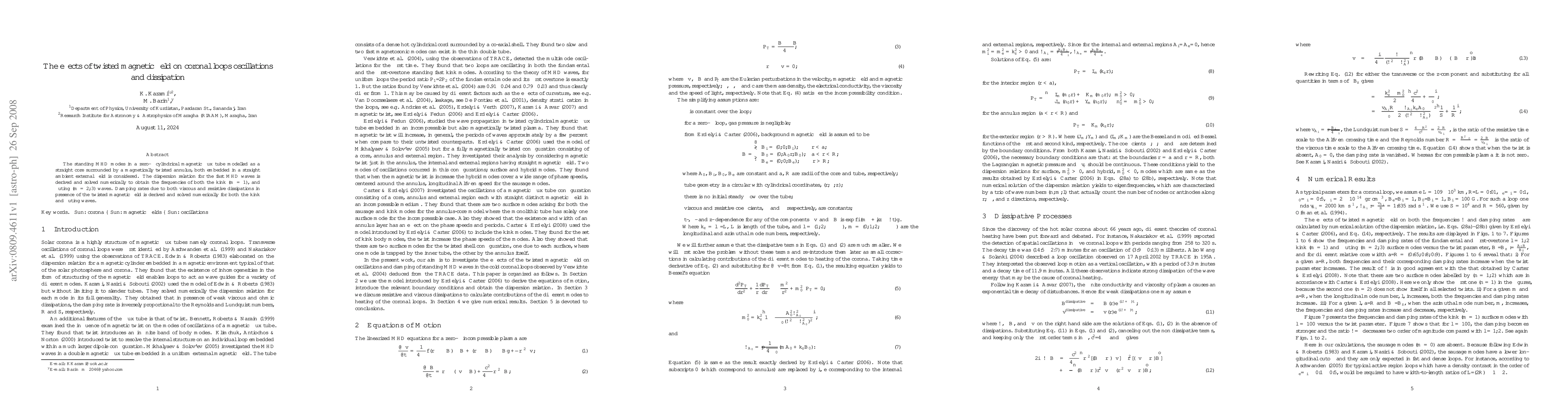 This research derives and numerically solves the dispersion relation for fast MHD waves in a twisted magnetic field model, determining frequencies for kink and fluting waves. It also calculates damping rates due to viscous and resistive dissipations for both wave types, providing insights into coronal loop oscillations and dissipation processes.