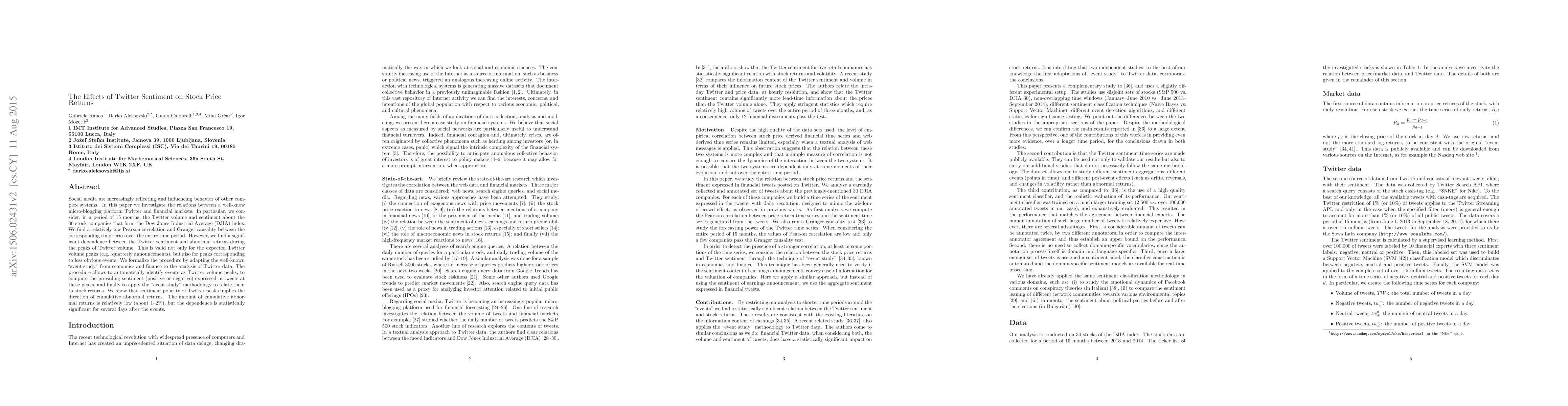 This paper examines the relationship between Twitter sentiment and stock price returns for the 30 companies in the Dow Jones Industrial Average over 15 months. It finds a significant link between Twitter sentiment and abnormal returns during periods of high Twitter volume, particularly around event peaks, with sentiment polarity influencing the direction of cumulative abnormal returns, albeit to a relatively small extent (1-2%).