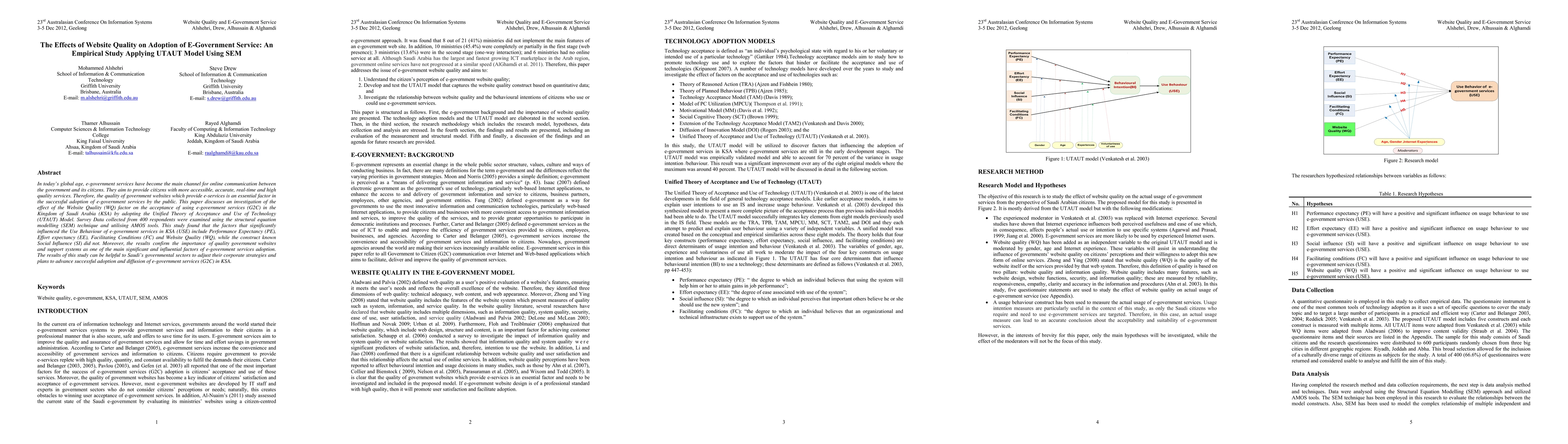 This study investigates the impact of Website Quality (WQ) on the adoption of e-government services in Saudi Arabia using the UTAUT model and SEM. Findings reveal that Performance Expectancy, Effort Expectancy, Facilitating Conditions, and Website Quality significantly influence e-government service use behavior, while Social Influence does not.
