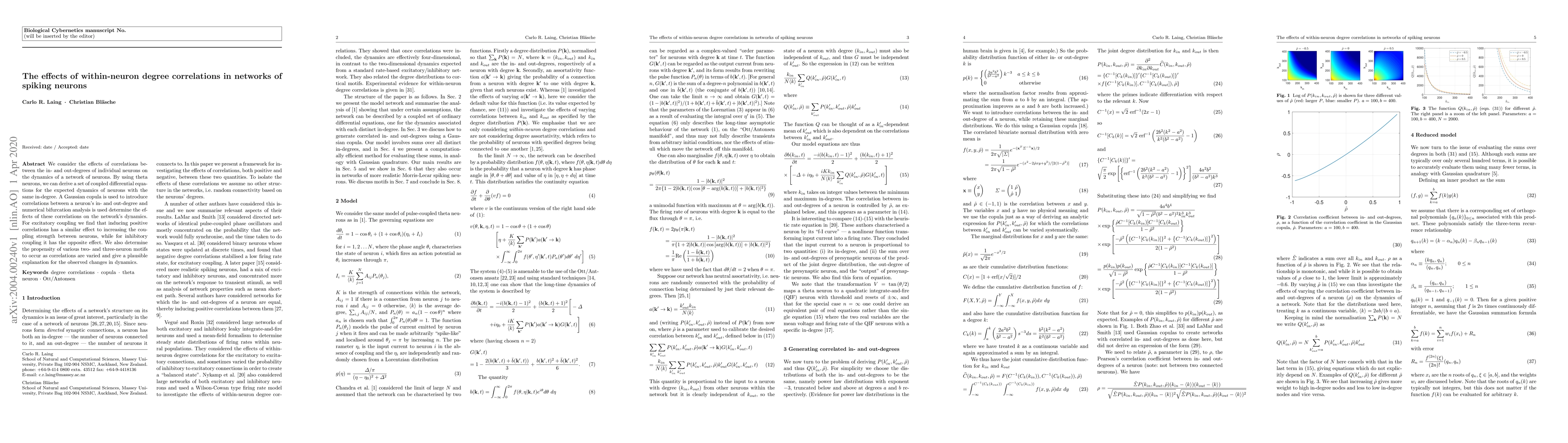 We consider the effects of correlations between the in- and out-degrees of individual neurons on the dynamics of a network of neurons. By using theta neurons, we can derive a set of coupled differential equations for the expected dynamics of neurons with the same in-degree. A Gaussian copula is used to introduce correlations between a neuron's in- and out-degree and numerical bifurcation analysis is used determine the effects of these correlations on the network's dynamics. For excitatory coupling we find that inducing positive correlations has a similar effect to increasing the coupling strength between neurons, while for inhibitory coupling it has the opposite effect. We also determine the propensity of various two- and three-neuron motifs to occur as correlations are varied and give a plausible explanation for the observed changes in dynamics.