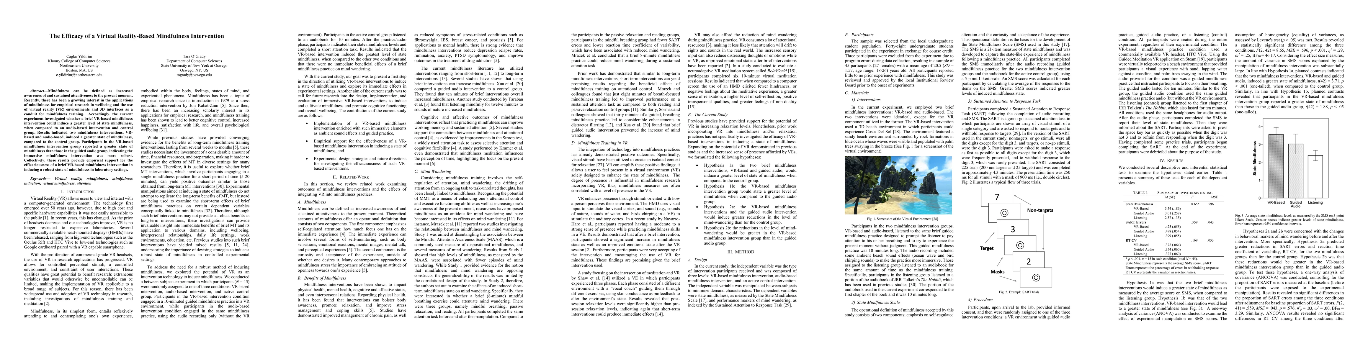 This study evaluates the efficacy of a VR-based mindfulness intervention compared to an audio-based intervention and a control group. Results show both interventions significantly increased state mindfulness, with the VR group reporting a greater effect, supporting the use of immersive VR for mindfulness training.