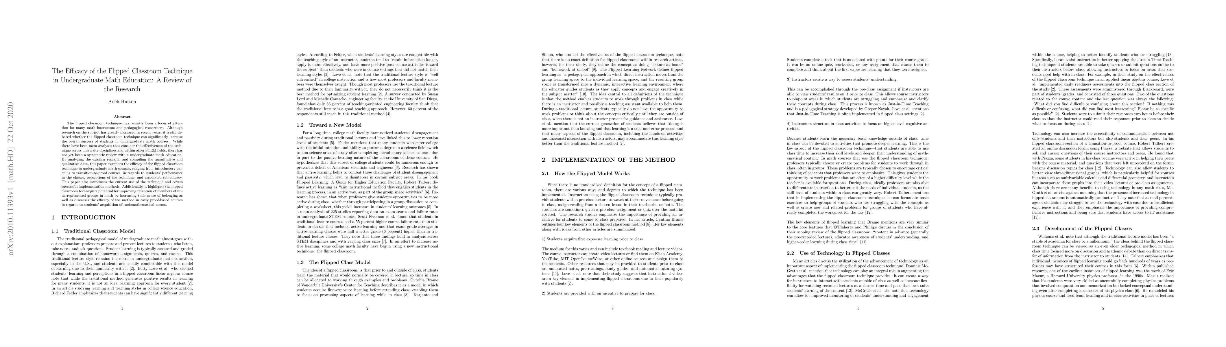 This paper reviews the efficacy of the flipped classroom technique in undergraduate mathematics education, finding mixed results on its impact on student performance, perceptions, and self-efficacy, while also noting its potential to improve retention and belonging among underrepresented groups.