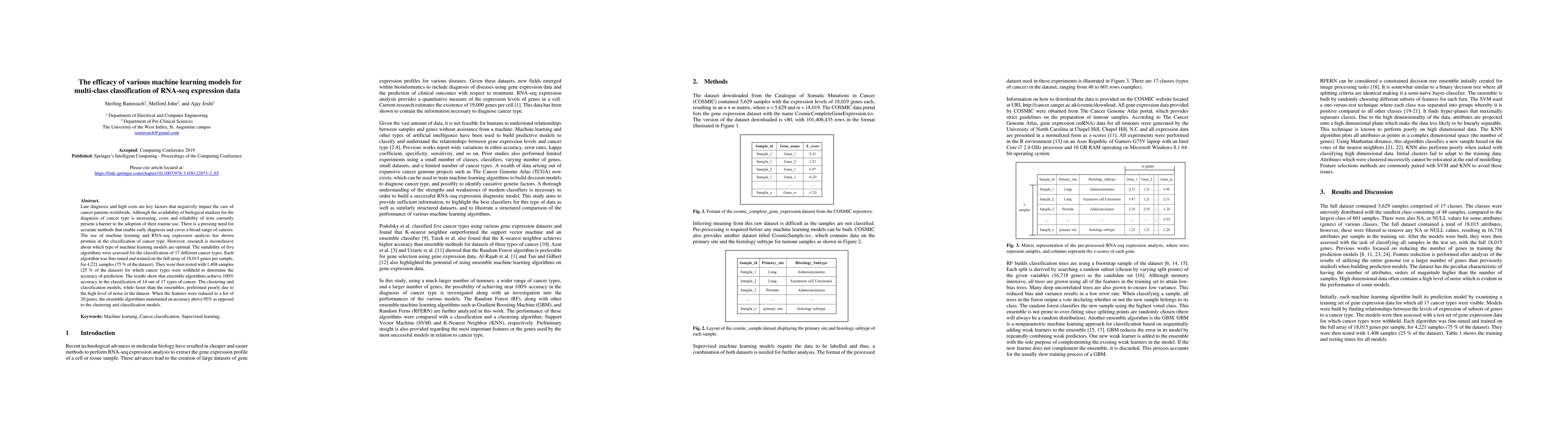 Late diagnosis and high costs are key factors that negatively impact the care of cancer patients worldwide. Although the availability of biological markers for the diagnosis of cancer type is increasing, costs and reliability of tests currently present a barrier to the adoption of their routine use. There is a pressing need for accurate methods that enable early diagnosis and cover a broad range of cancers. The use of machine learning and RNA-seq expression analysis has shown promise in the classification of cancer type. However, research is inconclusive about which type of machine learning models are optimal. The suitability of five algorithms were assessed for the classification of 17 different cancer types. Each algorithm was fine-tuned and trained on the full array of 18,015 genes per sample, for 4,221 samples (75 % of the dataset). They were then tested with 1,408 samples (25 % of the dataset) for which cancer types were withheld to determine the accuracy of prediction. The results show that ensemble algorithms achieve 100% accuracy in the classification of 14 out of 17 types of cancer. The clustering and classification models, while faster than the ensembles, performed poorly due to the high level of noise in the dataset. When the features were reduced to a list of 20 genes, the ensemble algorithms maintained an accuracy above 95% as opposed to the clustering and classification models.