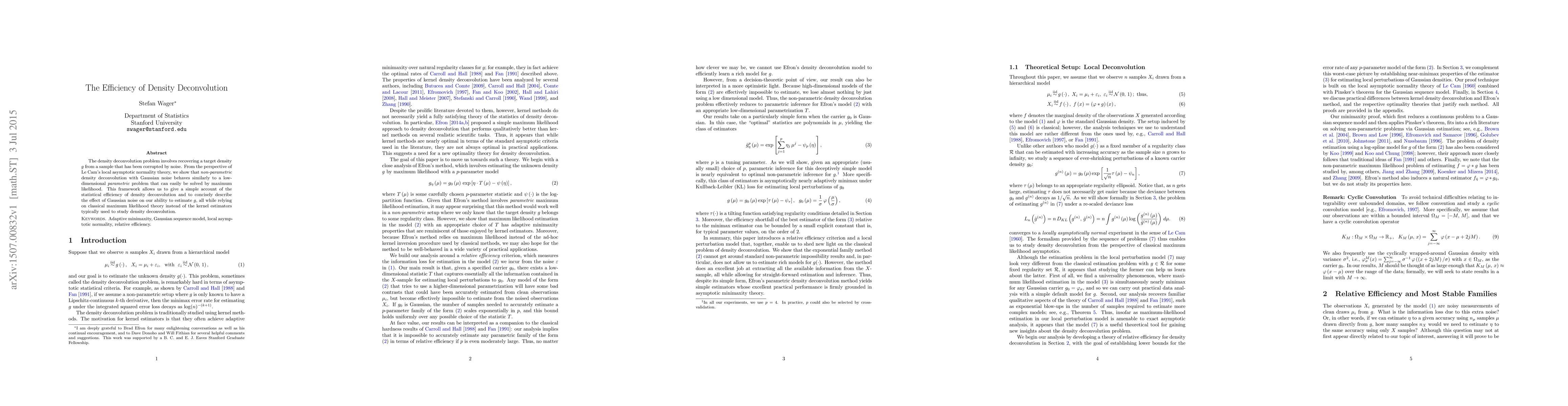 The density deconvolution problem involves recovering a target density g from a sample that has been corrupted by noise. From the perspective of Le Cam's local asymptotic normality theory, we show that non-parametric density deconvolution with Gaussian noise behaves similarly to a low-dimensional parametric problem that can easily be solved by maximum likelihood. This framework allows us to give a simple account of the statistical efficiency of density deconvolution and to concisely describe the effect of Gaussian noise on our ability to estimate g, all while relying on classical maximum likelihood theory instead of the kernel estimators typically used to study density deconvolution.