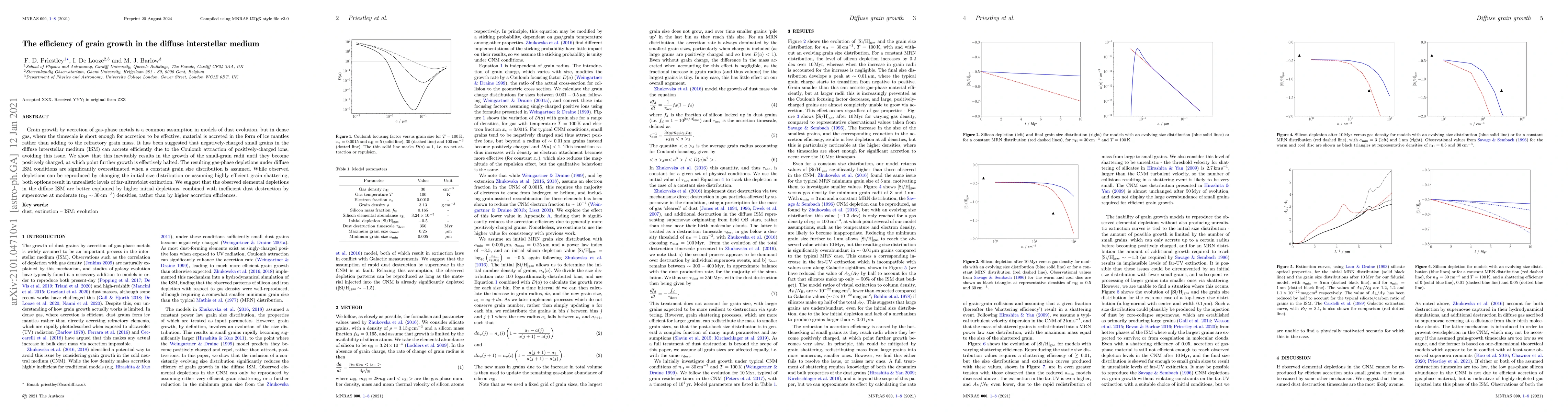 The paper challenges the assumption of efficient grain growth in the diffuse interstellar medium (ISM) via accretion of gas-phase metals, suggesting that small negatively-charged grains attract positively-charged ions, but growth halts when grains become positively charged. This leads to overestimation of gas-phase depletions. The study proposes that higher initial depletions combined with inefficient supernova-driven dust destruction at moderate densities better explain observed elemental depletions in the diffuse ISM, compared to higher accretion efficiencies.