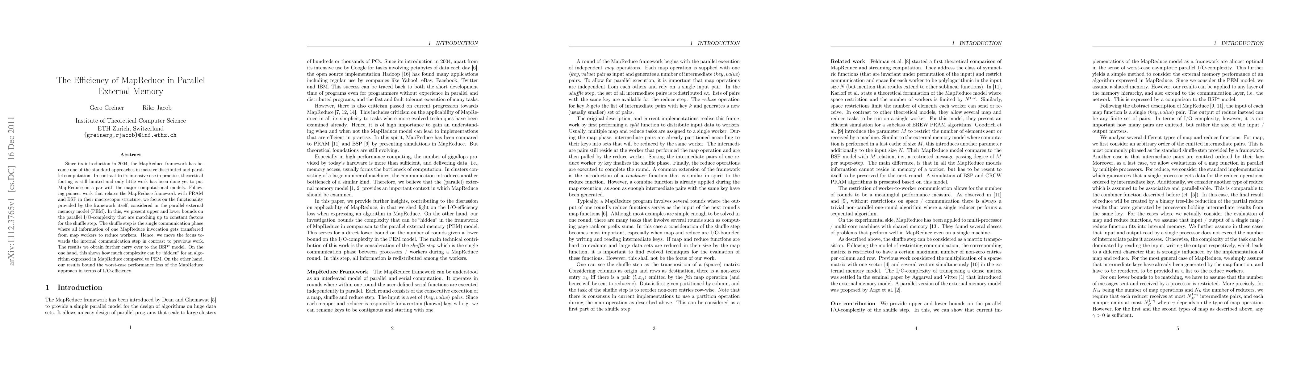 The paper establishes matching upper and lower bounds for the parallel I/O-complexity of the shuffle step in MapReduce within the PEM model.