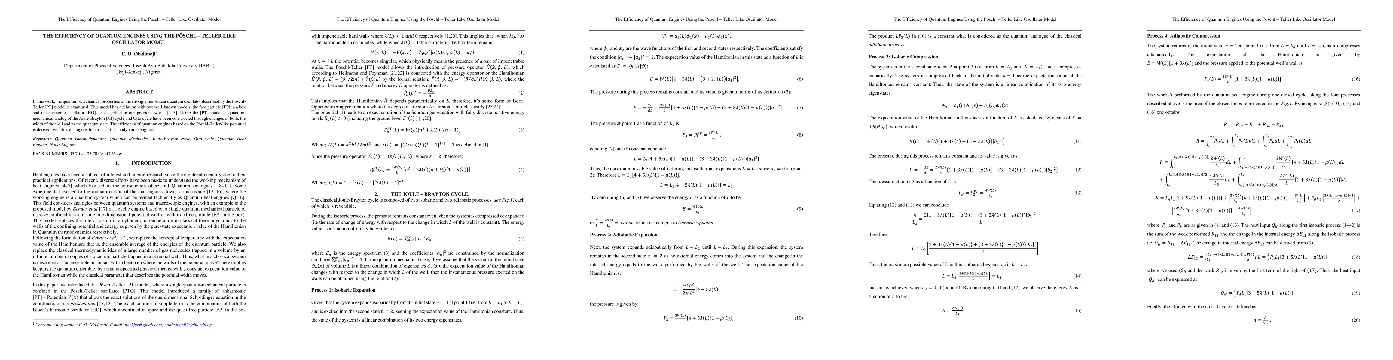 This paper explores the quantum-mechanical properties of the non-linear Poschl-Teller oscillator and constructs quantum analogs of the Joule-Brayton and Otto cycles. The efficiency of quantum engines based on the Poschl-Teller potential is derived, providing insights into their performance compared to classical thermodynamic engines.