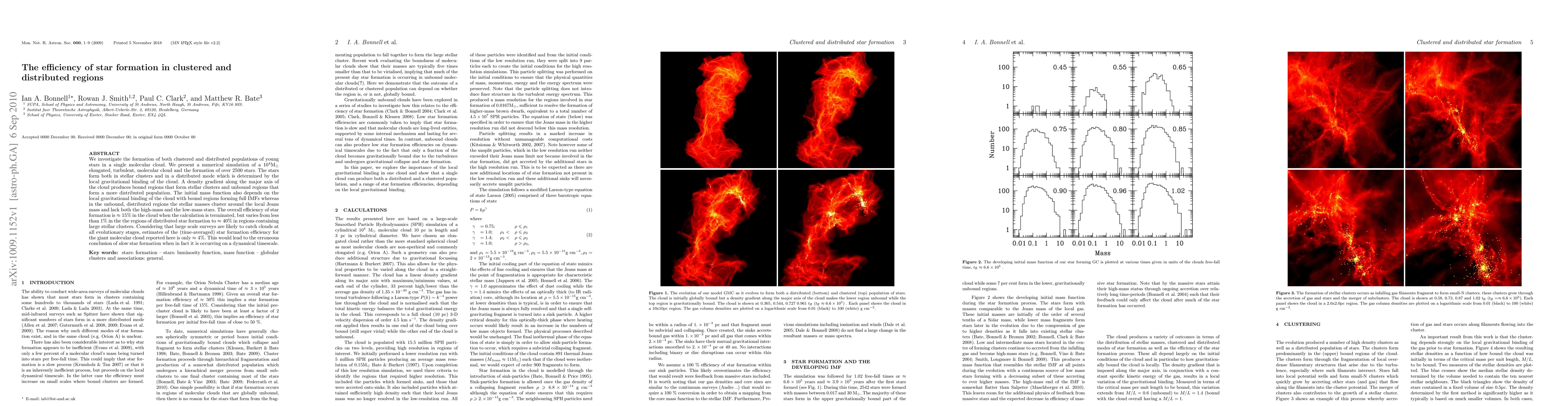 We investigate the formation of both clustered and distributed populations of young stars in a single molecular cloud. We present a numerical simulation of a 10,000 solar mass elongated, turbulent, molecular cloud and the formation of over 2500 stars. The stars form both in stellar clusters and in a distributed mode which is determined by the local gravitational binding of the cloud. A density gradient along the major axis of the cloud produces bound regions that form stellar clusters and unbound regions that form a more distributed population. The initial mass function also depends on the local gravitational binding of the cloud with bound regions forming full IMFs whereas in the unbound, distributed regions the stellar masses cluster around the local Jeans mass and lack both the high-mass and the low-mass stars. The overall efficiency of star formation is ~ 15 % in the cloud when the calculation is terminated, but varies from less than 1 % in the the regions of distributed star formation to ~ 40 % in regions containing large stellar clusters. Considering that large scale surveys are likely to catch clouds at all evolutionary stages, estimates of the (time-averaged) star formation efficiency for the giant molecular cloud reported here is only ~ 4 %. This would lead to the erroneous conclusion of 'slow' star formation when in fact it is occurring on a dynamical timescale.