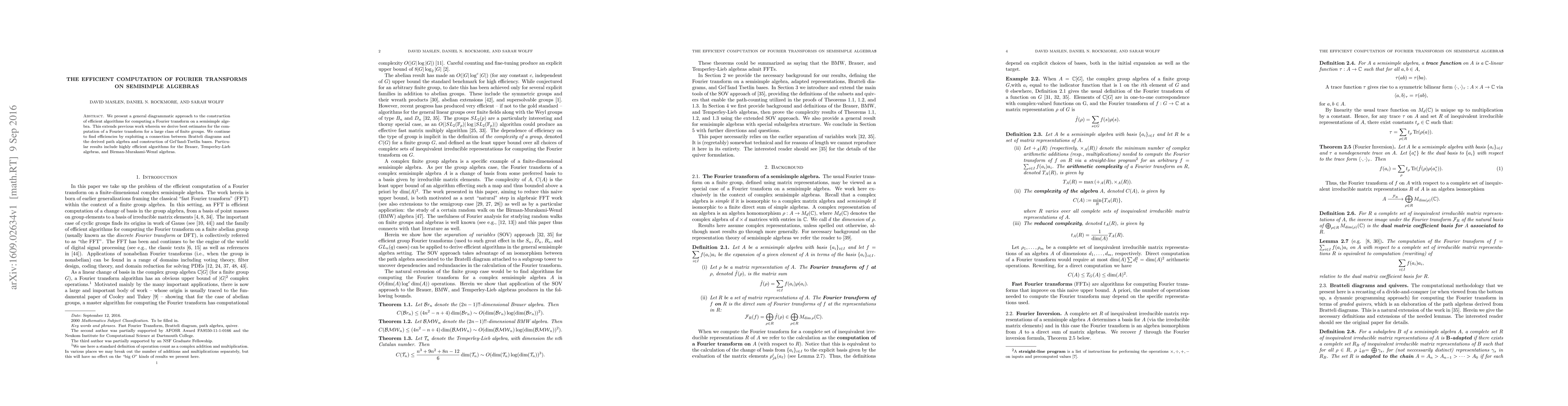 We present a general diagrammatic approach to the construction of efficient algorithms for computing a Fourier transform on a semisimple algebra. This extends previous work wherein we derive best estimates for the computation of a Fourier transform for a large class of finite groups. We continue to find efficiencies by exploiting a connection between Bratteli diagrams and the derived path algebra and construction of Gel'fand-Tsetlin bases. Particular results include highly efficient algorithms for the Brauer, Temperley-Lieb algebras, and Birman-Murakami-Wenzl algebras.