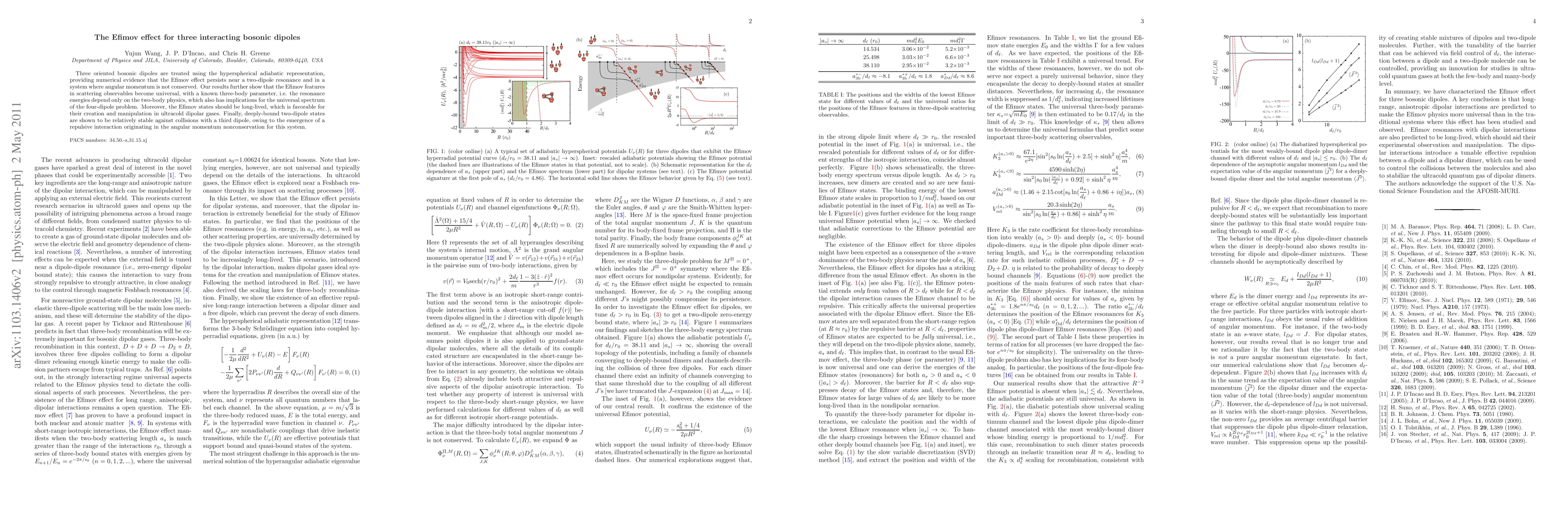 Three oriented bosonic dipoles are treated using the hyperspherical adiabatic representation, providing numerical evidence that the Efimov effect persists near a two-dipole resonance and in a system where angular momentum is not conserved. Our results further show that the Efimov features in scattering observables become universal, with a known three-body parameter, i.e. the resonance energies depend only on the two-body physics, which also has implications for the universal spectrum of the four-dipole problem. Moreover, the Efimov states should be long-lived, which is favorable for their creation and manipulation in ultracold dipolar gases. Finally, deeply-bound two-dipole states are shown to be relatively stable against collisions with a third dipole, owing to the emergence of a repulsive interaction originating in the angular momentum nonconservation for this system.