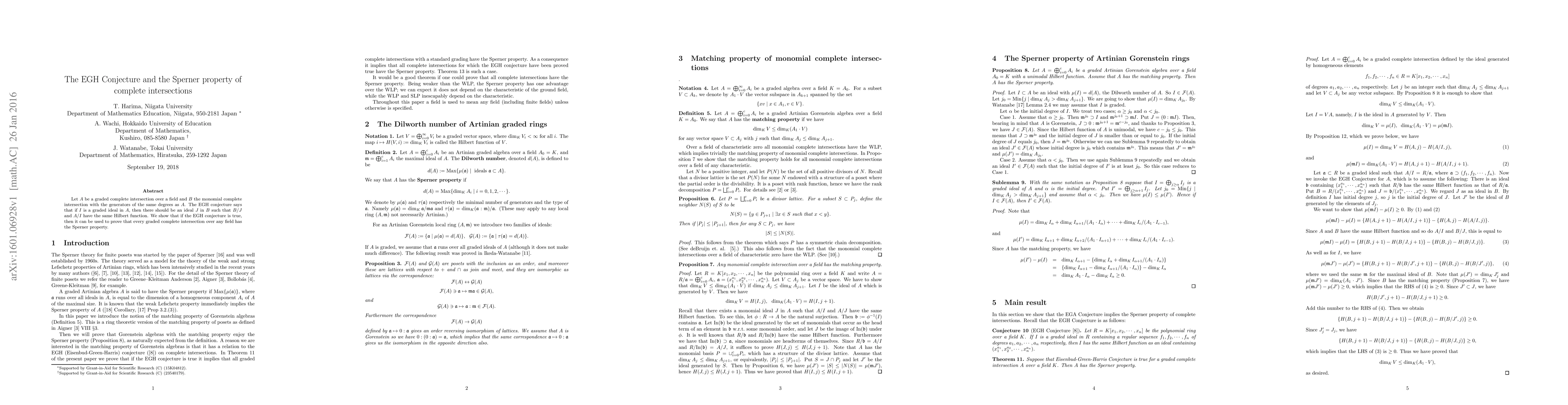 Let $A$ be a graded complete intersection over a field and $B$ the monomial complete intersection with the generators of the same degrees as $A$. The EGH conjecture says that if $I$ is a graded ideal in $A$, then there should be an ideal $J$ in $B$ such that $B/J$ and $A/I$ have the same Hilbert function. We show that if the EGH conjecture is true, then it can be used to prove that every graded complete intersection over any field has the Sperner property.