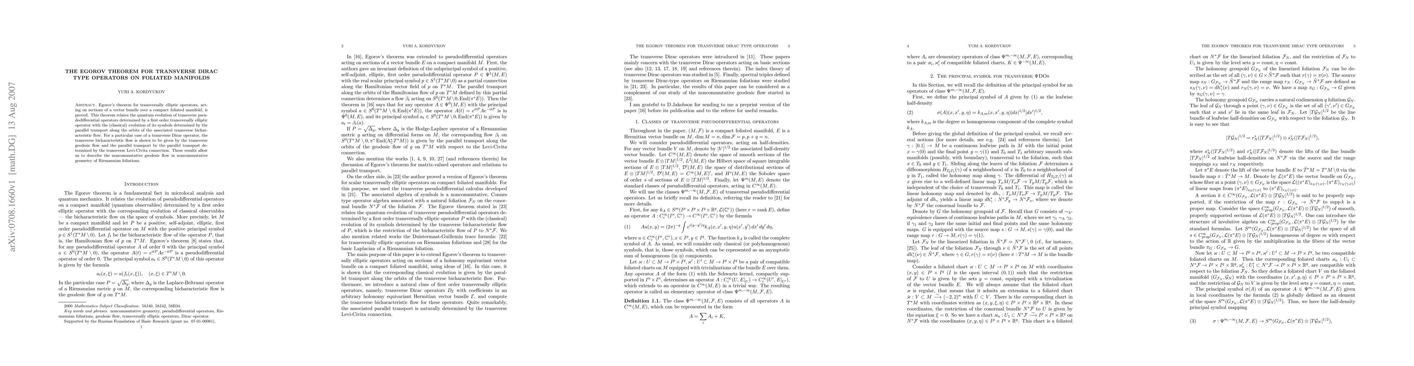 This paper proves Egorov's theorem for transversely elliptic operators on compact foliated manifolds, linking quantum evolution of transversal pseudodifferential operators to classical evolution of their symbols via parallel transport along transverse geodesic flows. It also describes the noncommutative geodesic flow in the context of Riemannian foliations.