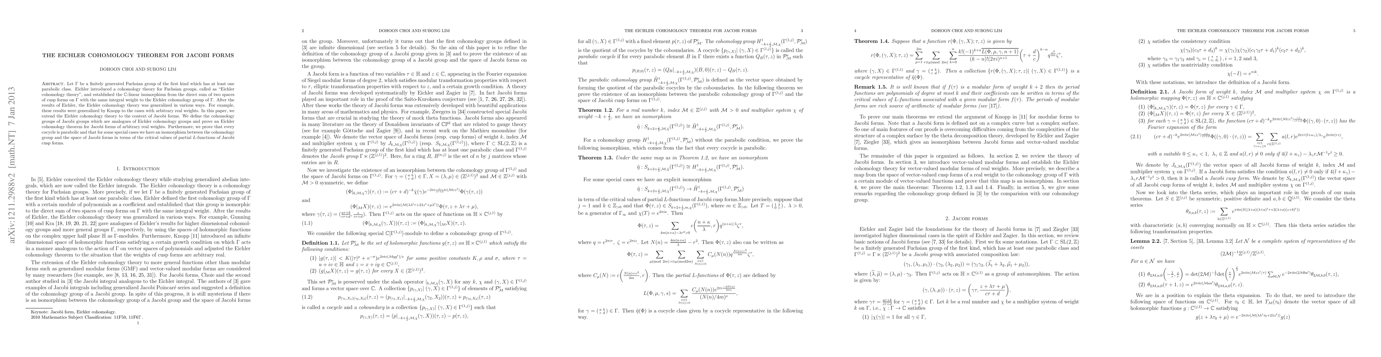 This paper extends Eichler cohomology theory to Jacobi forms, defining analogous cohomology groups for Jacobi groups and proving an Eichler cohomology theorem for Jacobi forms with arbitrary real weights. It also establishes that every cocycle is parabolic and identifies an isomorphism between the cohomology group and the space of Jacobi forms in specific cases.