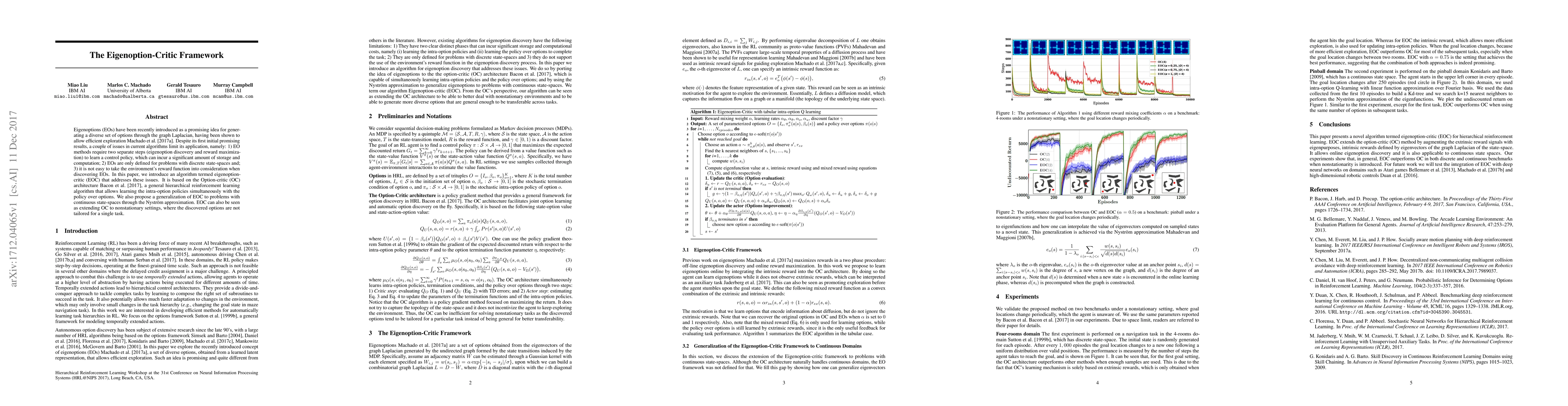 Eigenoptions (EOs) have been recently introduced as a promising idea for generating a diverse set of options through the graph Laplacian, having been shown to allow efficient exploration. Despite its initial promising results, a couple of issues in current algorithms limit its application, namely: (1) EO methods require two separate steps (eigenoption discovery and reward maximization) to learn a control policy, which can incur a significant amount of storage and computation; (2) EOs are only defined for problems with discrete state-spaces and; (3) it is not easy to take the environment's reward function into consideration when discovering EOs. To addresses these issues, we introduce an algorithm termed eigenoption-critic (EOC) based on the Option-critic (OC) framework [Bacon17], a general hierarchical reinforcement learning (RL) algorithm that allows learning the intra-option policies simultaneously with the policy over options. We also propose a generalization of EOC to problems with continuous state-spaces through the Nystr\"om approximation. EOC can also be seen as extending OC to nonstationary settings, where the discovered options are not tailored for a single task.