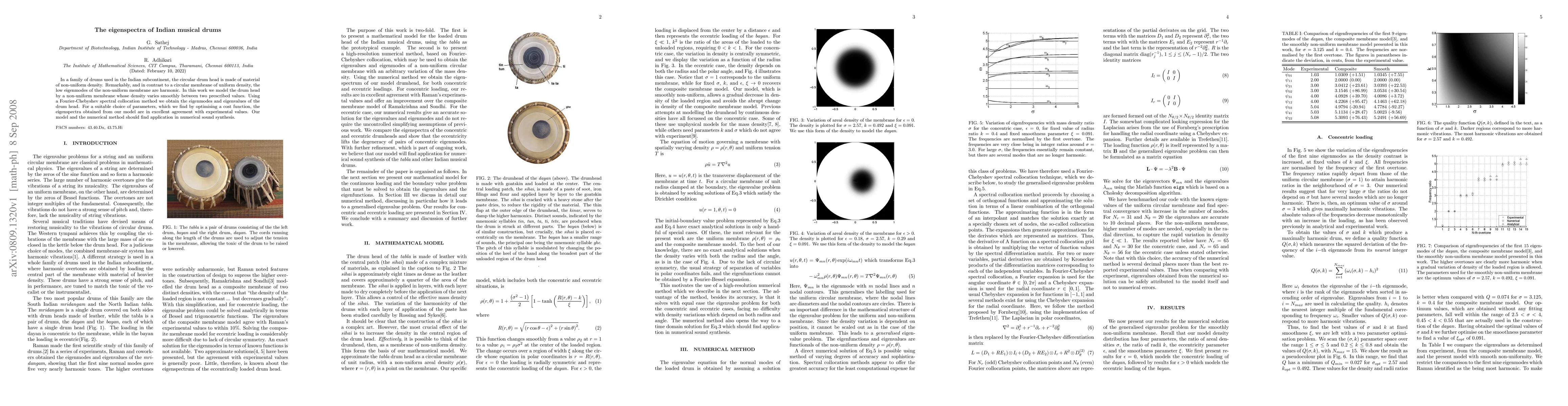 This research models the eigenspectra of Indian musical drums with non-uniform density drum heads, revealing that low eigenmodes are harmonic. Using a Fourier-Chebyshev spectral collocation method, the study accurately predicts eigenmodes and eigenvalues, aligning closely with experimental data, which could enhance numerical sound synthesis.
