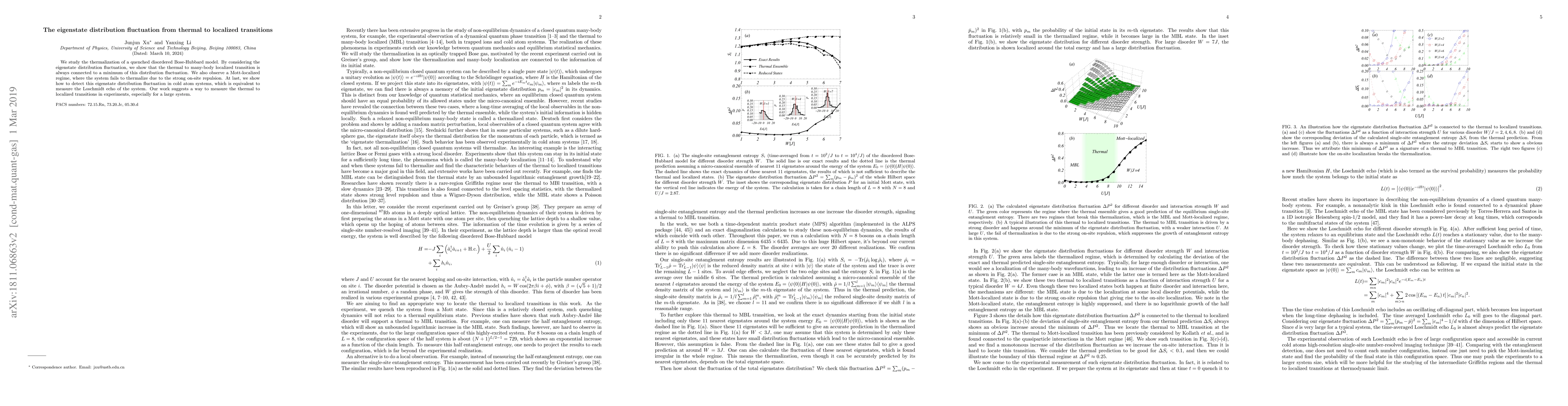 We study the thermalization of a quenched disordered Bose-Hubbard model. By considering the eigenstate distribution fluctuation, we show that the thermal to many-body localized transition is always connected to a minimum of this distribution fluctuation. We also observe a Mott-localized regime, where the system fails to thermalize due to the strong on-site repulsion. At last, we show how to detect this eigenstate distribution fluctuation in cold atom systems, which is equivalent to measure the Loschmidt echo of the system. Our work suggests a way to measure the thermal to localized transitions in experiments, especially for a large system.