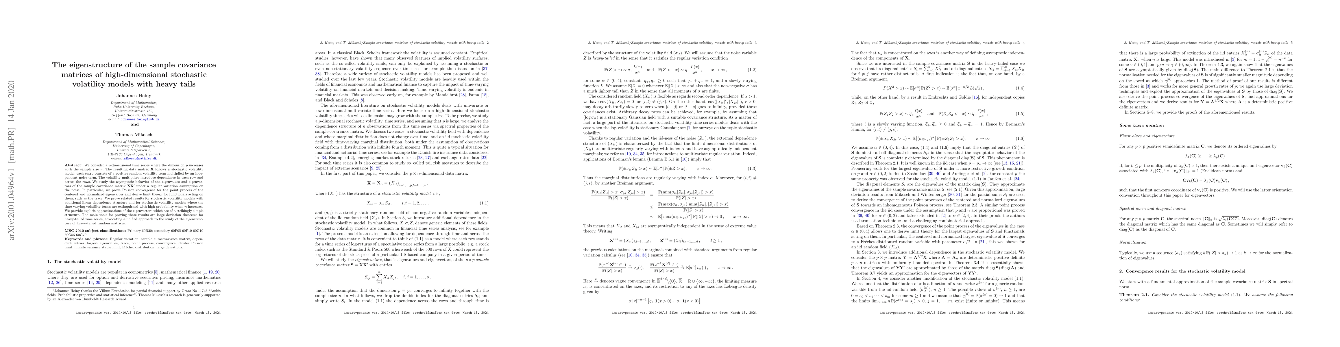 We consider a $p$-dimensional time series where the dimension $p$ increases with the sample size $n$. The resulting data matrix $X$ follows a stochastic volatility model: each entry consists of a positive random volatility term multiplied by an independent noise term. The volatility multipliers introduce dependence in each row and across the rows. We study the asymptotic behavior of the eigenvalues and eigenvectors of the sample covariance matrix $XX'$ under a regular variation assumption on the noise. In particular, we prove Poisson convergence for the point process of the centered and normalized eigenvalues and derive limit theory for functionals acting on them, such as the trace. We prove related results for stochastic volatility models with additional linear dependence structure and for stochastic volatility models where the time-varying volatility terms are extinguished with high probability when $n$ increases. We provide explicit approximations of the eigenvectors which are of a strikingly simple structure. The main tools for proving these results are large deviation theorems for heavy-tailed time series, advocating a unified approach to the study of the eigenstructure of heavy-tailed random matrices.