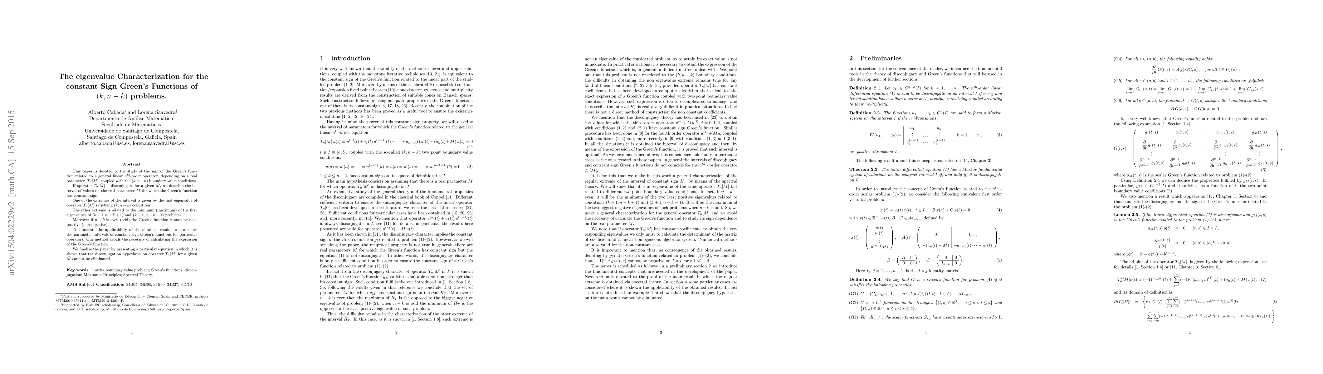 This paper is devoted to the study of the sign of the Green's function related to a general linear $n^{\rm th}$-order operator, depending on a real parameter, $T_n[M]$, coupled with the $(k,n-k)$ boundary value conditions. If operator $T_n[\bar M]$ is disconjugate for a given $\bar M$, we describe the interval of values on the real parameter $M$ for which the Green's function has constant sign. One of the extremes of the interval is given by the first eigenvalue of operator $T_n[\bar M]$ satisfying $(k,n-k)$ conditions. The other extreme is related to the minimum (maximum) of the first eigenvalues of $(k-1,n-k+1)$ and $(k+1,n-k-1)$ problems. Moreover if $n-k$ is even (odd) the Green's function cannot be non-positive (non-negative). To illustrate the applicability of the obtained results, we calculate the parameter intervals of constant sign Green's functions for particular operators. Our method avoids the necessity of calculating the expression of the Green's function. We finalize the paper by presenting a particular equation in which it is shown that the disconjugation hypothesis on operator $T_n[\bar M]$ for a given $\bar M$ cannot be eliminated.